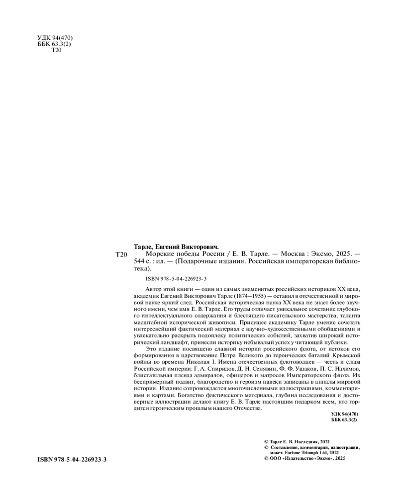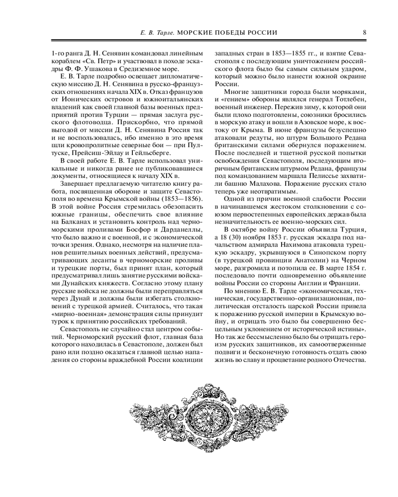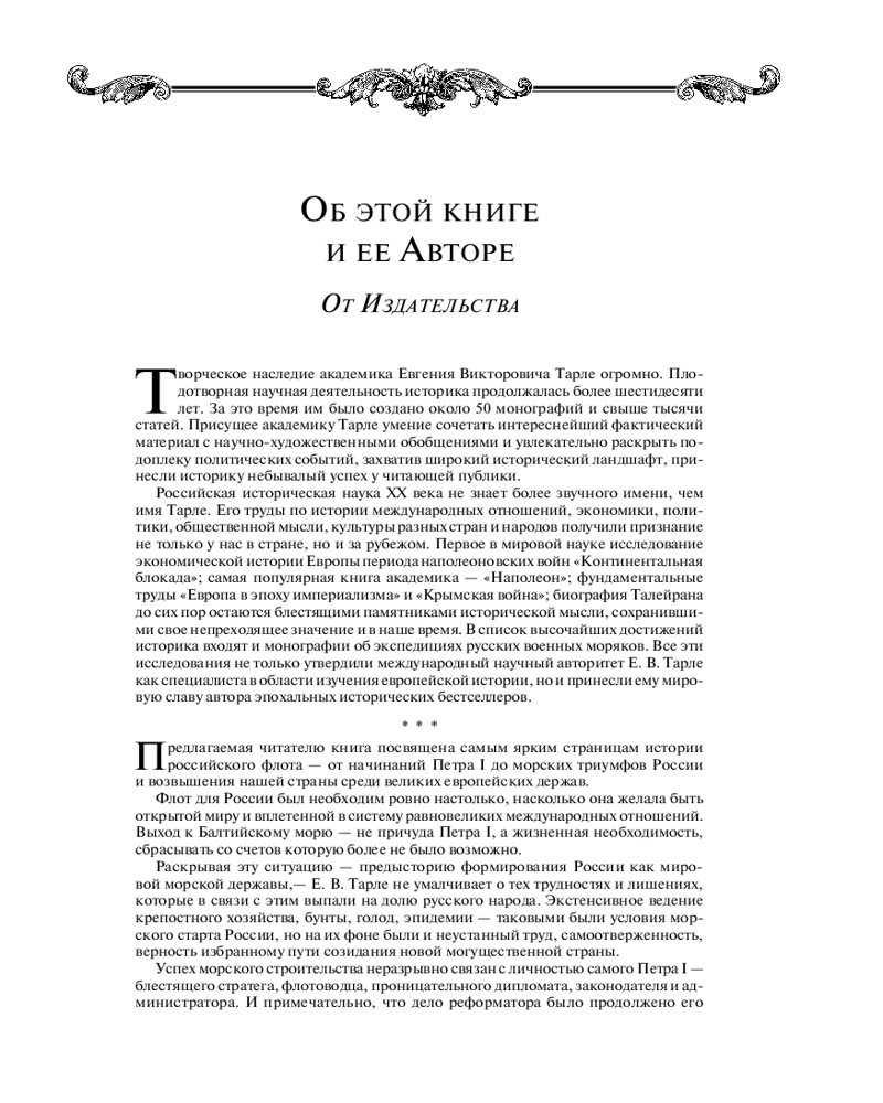 Серия: Подарочные издания. Российская императорская библиотека Перед вами книга, в которую вошли работы Е. В. Тарле о военной морской истории России, — не только история создания, становления, укрепления, побед и поражений российского флота от времен Петра Великого до Крымской войны 1853–1856 годов, но прежде всего — история внешней политики России и динамики ее взаимоотношений с соседями, исконными противниками и временными союзниками. В книге раскрыты истоки морского триумфа России и ее возвышения среди великих европейских держав, а многие из исторических документов XIX века были впервые введены в научный оборот именно благодаря работам Е. В. Тарле.