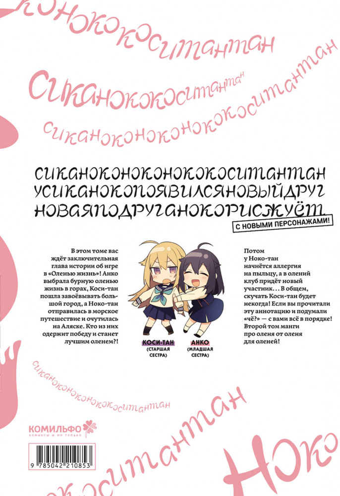 В этом томе вас ждёт заключительная глава истории об игре в «Оленью жизнь»! Анко выбрала бурную оленью жизнь в горах, Коси-тан пошла завоёвывать большой город, а Ноко-тан отправилась в морское путешествие и очутилась на Аляске. Кто из них одержит победу и станет лучшим оленем?! Потом у Ноко-тан начнётся аллергия на пыльцу, а в олений клуб придёт новый участник... В общем, скучать Коси-тан будет некогда! Если вы прочитали эту аннотацию и подумали «чё?» — с вами всё в порядке! Второй том манги про оленя от оленя для оленей! |