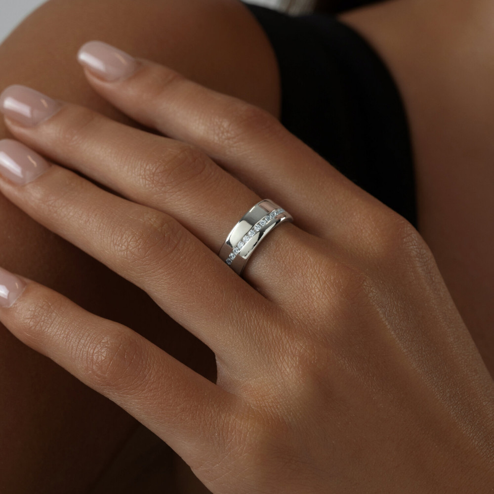 Красивое, добротное кольцо. Довольно толстая шинка. Взяла себе, т.к. очень понравился дизайн, а еще на него была хорошая скидка, за что отдельное спасибо, Flip! Смотрится дорого, ощущение, что оно из белого золота. Инкрустация камнями идет по всей шинке кольца, причем она идет на разных уровнях. Повернешь так: будет инкрустация как на фото, по-другому повернешь - будет или вверху, или внизу шинки. В общем есть 3 варианта носки этого кольца. Я очень довольна покупкой!