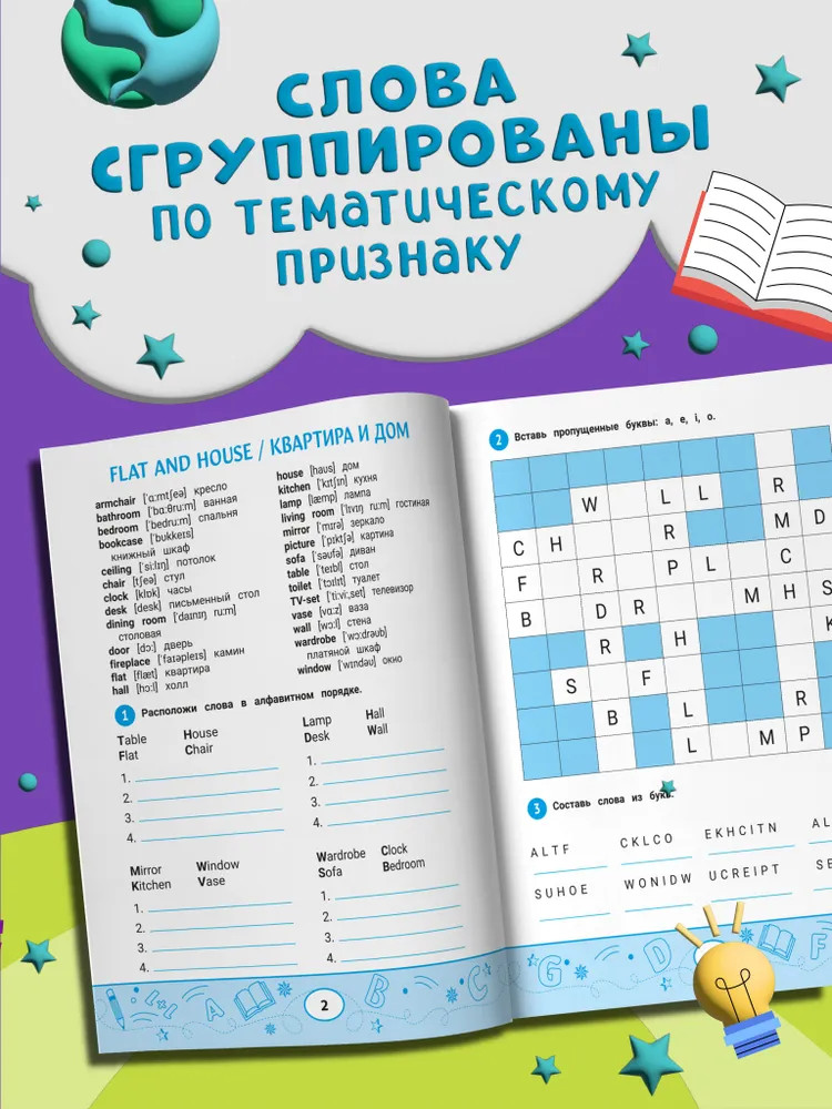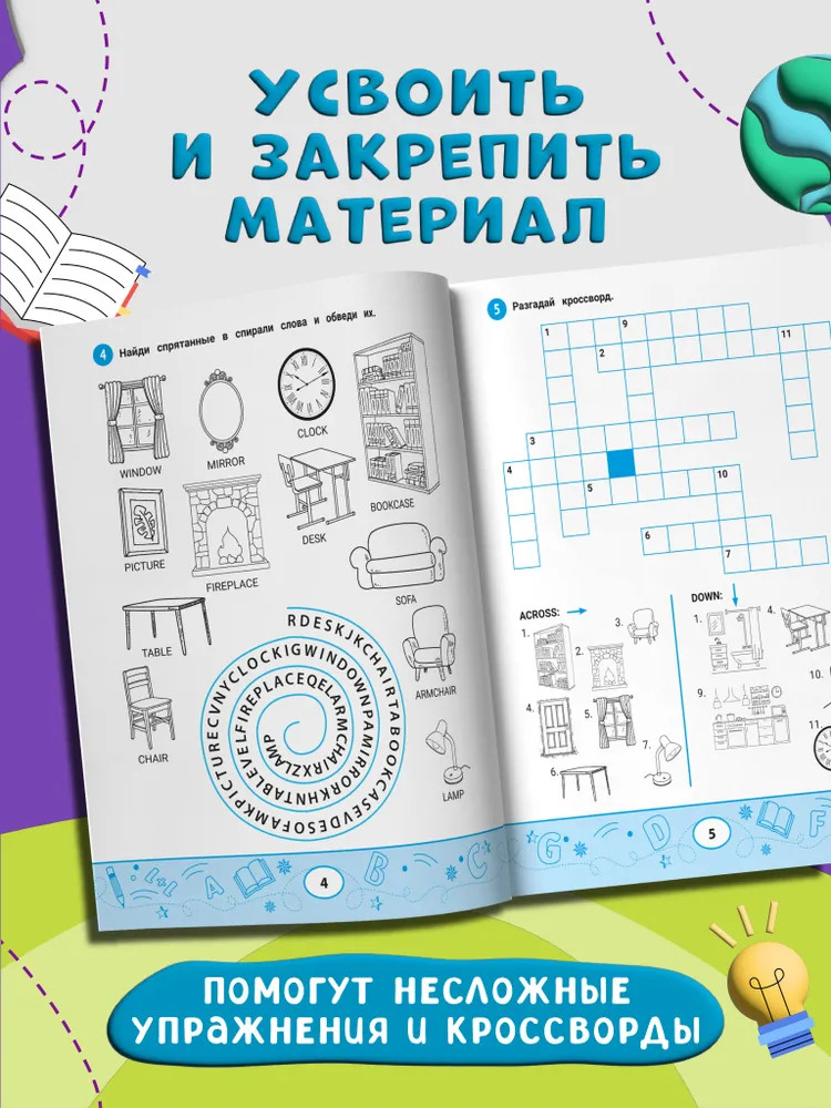 Серия: Пиши-читай Словарик по английскому языку, составленный в помощь учащимся начальной школы, знакомит детей с лексикой по темам «Квартира и дом», «На кухне», «Еда», «Фрукты и овощи», «В городе», «Транспорт», «Здоровье». Слова сгруппированы по тематическому признаку, что даёт возможность учащемуся быть готовым раскрыть конкретную тему в полном объёме в соответствии с требованиями к уровню знаний в начальной школе. Усвоить и закрепить представленный материал помогут несложные упражнения и кроссворды. |