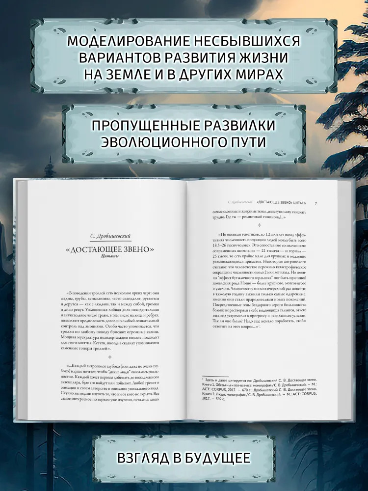 Серия: Фантастика. Русский путь Вы держите в своих руках очень редкого зверя — антологию эволюционной фантастики, размышления писателей-фантастов о том, как могло бы быть, пойди эволюция иначе. И вдохновил их в значительной степени двухтомный научный труд известного антрополога Станислава Дробышевского Достающее звено. Моделирование несбывшихся вариантов на Земле и в других мирах. Пропущенные развилки эволюционного пути. Взгляд в будущее. Классификация драконов, рассуждения о природе вампиров, непривычный взгляд на мифы о Соловье-разбойнике и горгоне Медузе. Чистая, подлинно научная фантастика от целой плеяды мастеров жанра Евгения Лукина, Олега Дивова, Святослава Логинова, Антона Первушина, Александра Громова, Владимира Васильева. |