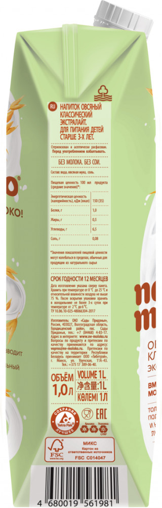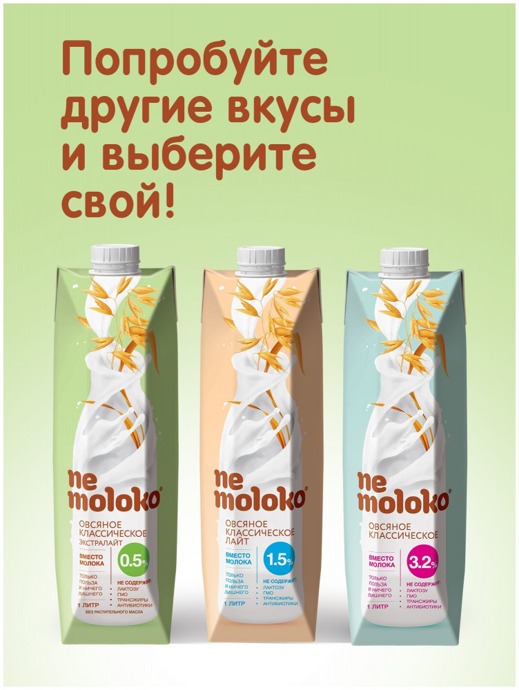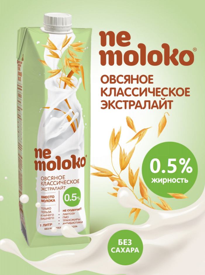 Nemoloko овсяное классическое Экстралайт — это отличный вариант для обычного и, особенно, для диетического рациона питания. Всего 35 Ккал в 100 мл продукта.
