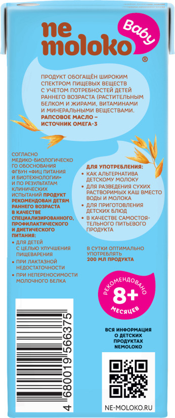 💳 Оплатить за товар можно при получении 🇰🇿 Есть бесплатная доставка по Казахстану от 1 дня 🎁 Копите бонусы с каждой покупки Серия: Baby Nemoloko овсяное детское — это специализированный 100 % растительный продукт, альтернатива детскому коровьему молоку. Продукт рекомендуется к употреблению детям, начиная с 8 месяцев в качестве ежедневного прикорма. Идеально подходит для детей с аллергией на молочный белок и непереносимостью лактозы. Продукт прошёл клинические исследования* и рекомендован детям раннего возраста в качестве специализированного, диетического, лечебного и профилактического питания. |