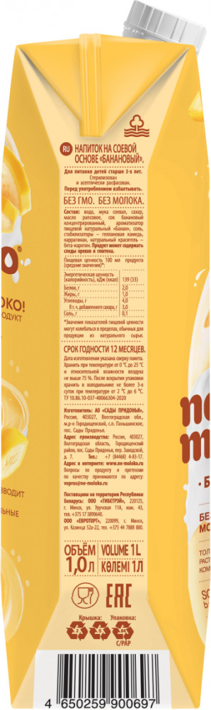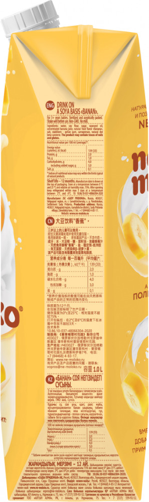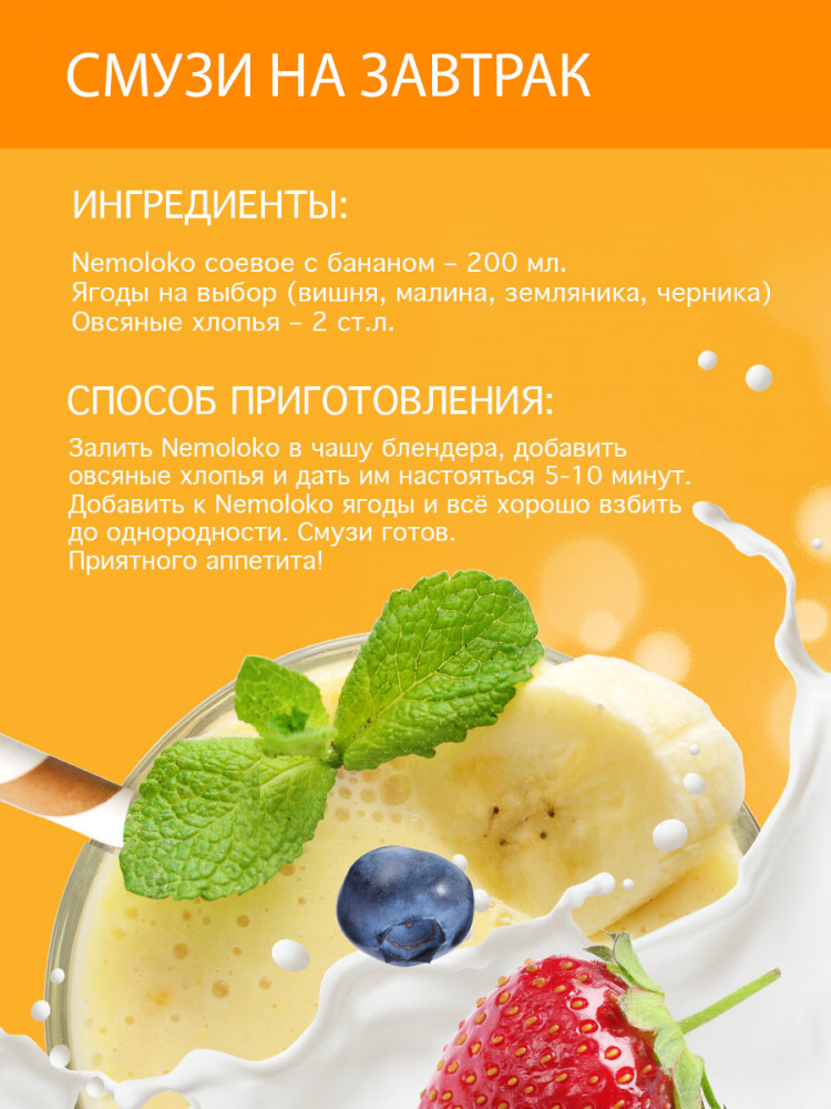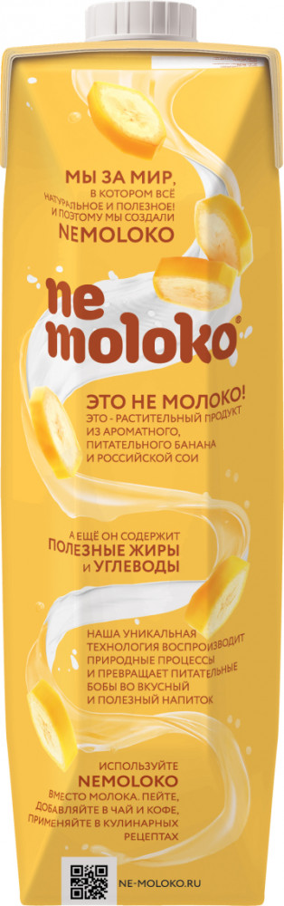 Nemoloko банановое — лёгкий и ароматный коктейль на основе сои. Нежный банановый напиток Nemoloko станет прекрасной основой для любых коктейлей на завтрак, отличным завершением обеда или приятным перекусом в течение дня. Nemoloko банановое это то, что нужно для отличного настроения, оно освежает и радует вкусом. Пейте охлажденным!