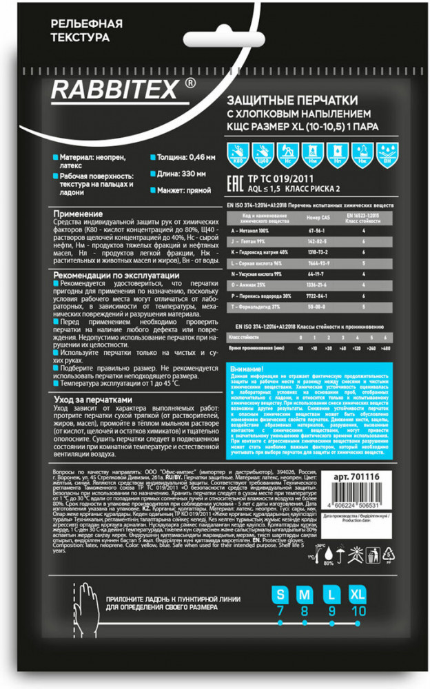 Неопреновые перчатки Rabbitex для защиты рук от загрязнений и химических факторов — кислот, щелочей, нефтепродуктов, растительных и животных масел и жиров, а также от воды и растворов нетоксичных веществ. Могут применяться в быту и на производстве.