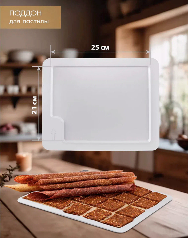 В конструкции предусмотрено 5 прозрачных лотков из пищевого AS-пластика. Лотки легко снимаются и моются, что упрощает уход за прибором. Вместительная камера позволяет одновременно сушить разные виды продуктов, экономя время.