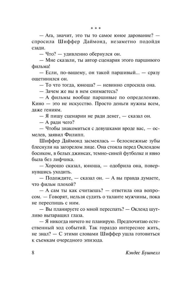 Кэндес Бушнелл (Candace Bushnell) родилась в маленьком городке Гластонбери (штат Коннектикут, США). Училась сначала в университете Райса в Техасе, затем перевелась в Нью-Йоркский университет, во время обучения в котором она с головой окунулась в богемную жизнь. |