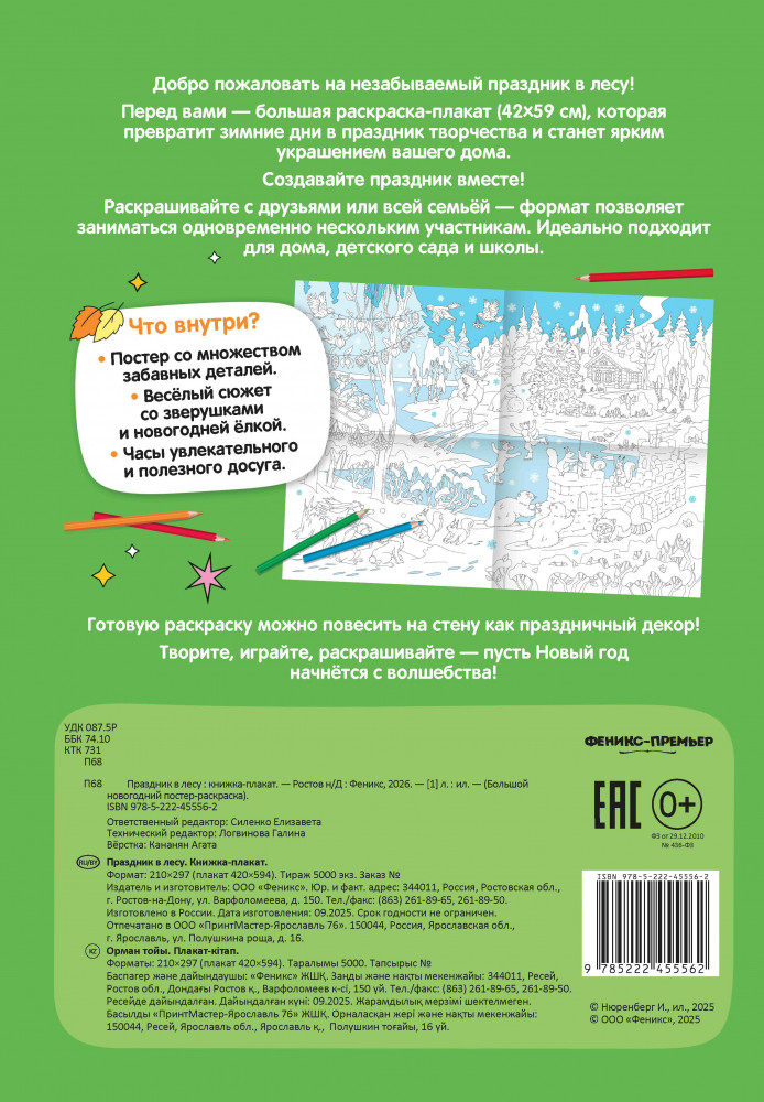 Серия: Большой новогодний постер-раскраска Добро пожаловать на незабываемый праздник в лесу! Перед вами — большая раскраска-плакат (42×59 см), которая превратит зимние дни в праздник творчества и станет ярким украшением вашего дома. Создавайте праздник вместе! Раскрашивайте с друзьями или всей семьёй — формат позволяет заниматься одновременно нескольким участникам. Идеально подходит для дома, детского сада и школы. |