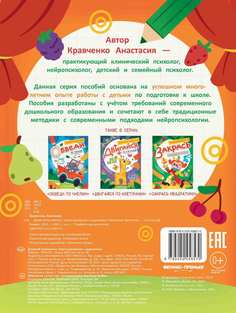 💳 Оплатить за товар можно при получении 🇰🇿 Есть бесплатная доставка по Казахстану от 1 дня 🎁 Копите бонусы с каждой покупки Серия: Графические диктанты Данная серия пособий основана на успешном многолетнем опыте работы с детьми по подготовке к школе. Пособия разработаны с учётом требований современного дошкольного образования и сочетают в себе традиционные методики с современными подходами нейропсихологии. |
