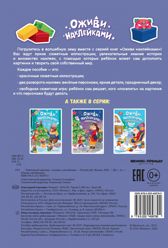 Серия: Оживи наклейками Погрузитесь в волшебную зиму вместе с серией книг «Оживи наклейками»! Вас ждут яркие сюжетные иллюстрации, увлекательные зимние истории и множество наклеек, с помощью которых ребёнок может сам дополнять картинки и творить свой собственный мир. |
