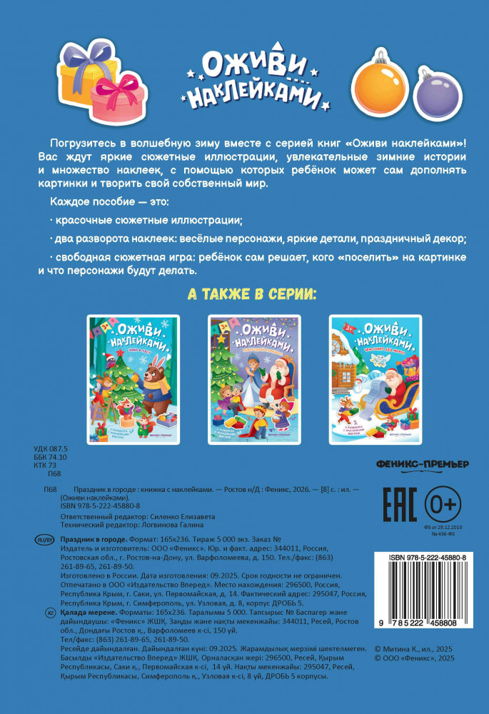 Серия: Оживи наклейками Погрузитесь в волшебную зиму вместе с серией книг «Оживи наклейками»! Вас ждут яркие сюжетные иллюстрации, увлекательные зимние истории и множество наклеек, с помощью которых ребёнок может сам дополнять картинки и творить свой собственный мир. |
