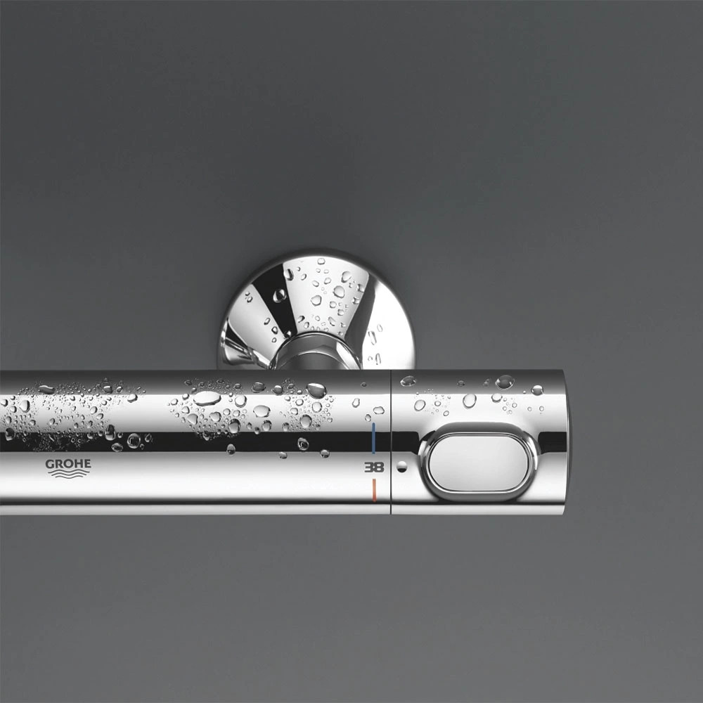 Смеситель оснащен передовыми технологиями, такими как Grohe Long-Life Shine, обеспечивающей долговечность хромированного покрытия, и Grohe SafeStop, которая предотвращает нагрев воды выше 38°C, защищая от ожогов. Встроенный термоэлемент Grohe TurboStat поддерживает постоянную температуру воды даже при изменении давления. Рукоятка смесителя оснащена экономичной кнопкой Grohe EcoButton, позволяющей контролировать расход воды, а технология Grohe WaterSaving помогает снизить водопотребление без потери качества потока. Рекомендованное минимальное давление для корректной работы смесителя — 1 бар. Душевой гарнитур не включен в комплект. Гарантия на смеситель составляет 5 лет, а производство находится в Португалии.