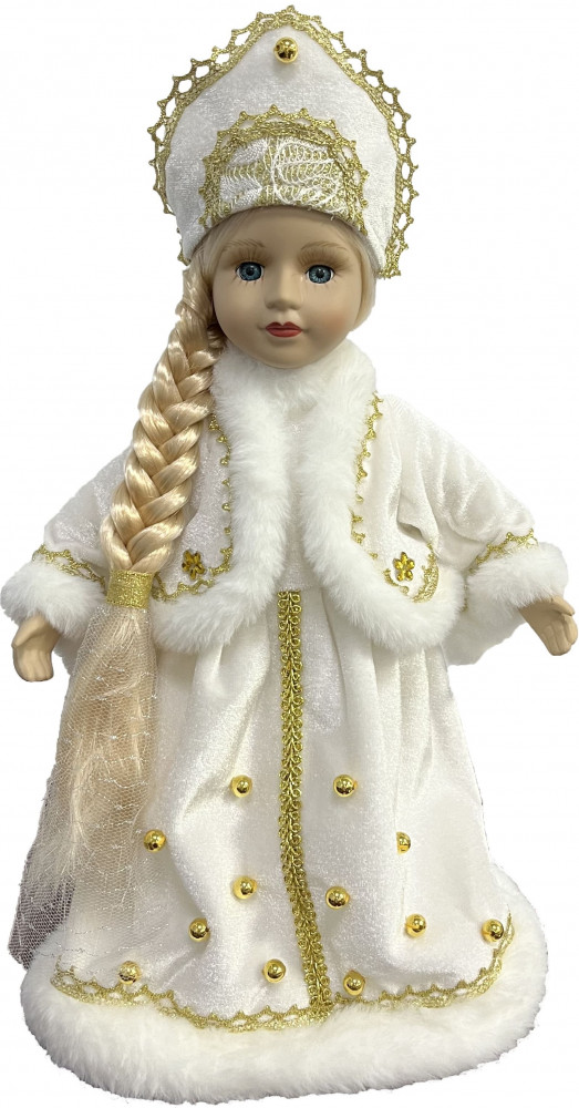 Декоративная кукла Снегурочка выполнена из высококачественной керамики. Туловище куклы мягкое набивное. Трогательные глаза обрамлены пышными ресницами, а светлые волосы заплетены в косу. Кукла максимально приближена к живому прототипу — юной леди с румянцем на щеках. Снегурочка наряжена в роскошную шубку декорированной тесьмой и блестками, а голова украшена кокошником. Кукла устанавливается на пластиковую подставку, благодаря которой вы можете поместить ее в любом понравившемся месте. |