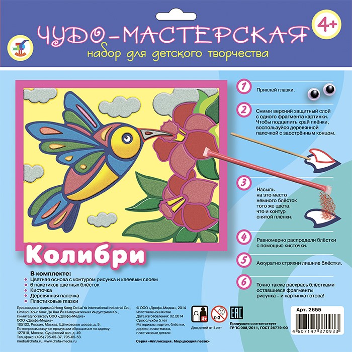 В набор входят: цветная основа с контуром рисунка и клеевым слоем, 6 трубочек цветных блёсток, кисточка, деревянная палочка, декоративные элементы на самоклеящейся основе (глазки), цветная листовка-образец.