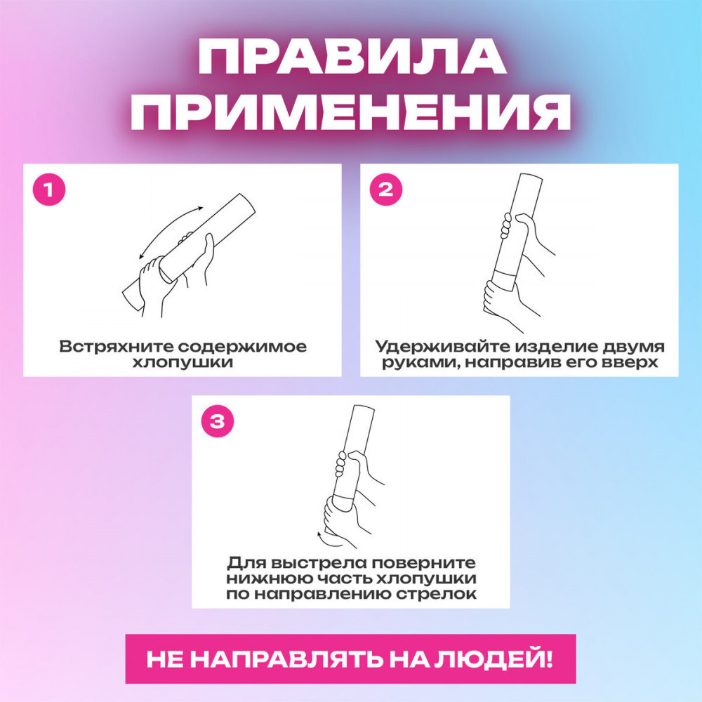 Пневматическая хлопушка не является пиротехникой и работает на основе энергии сжатого воздуха. Конфетти и серпантин ярких цветов можно использовать в помещении или на улице. Хлопушка подойдет для праздников, концертов, реквизита для фотосессии. |