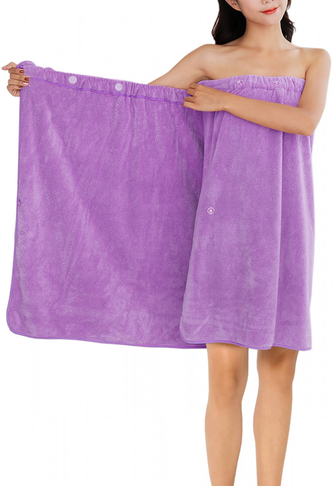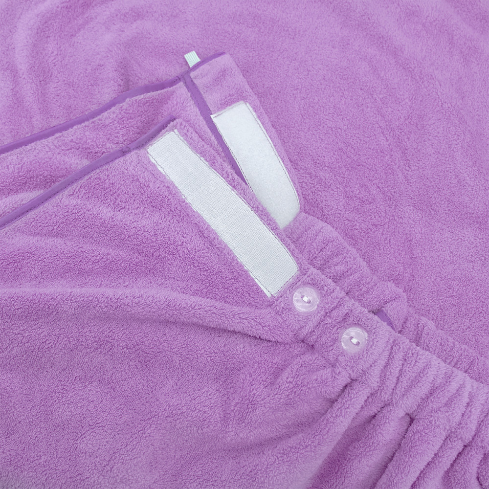 Большое, ниже колен при росте 1.60, очень мягкое, приятное к телу. Липучки надёжные, но есть ещё и дополнительное крепление на пуговицы. Особенно удобно, что они есть и посередине, полотенце не распахивается.