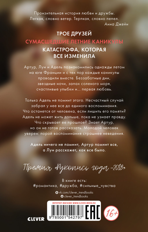 Артур, Луи и Адель познакомились однажды летом на юге Франции и с тех пор каждые каникулы проводили вместе. Беззаботные дни, звездные ночи, запах соленого моря, счастливые улыбки и... первая любовь. Только Адель не помнит этого. Несчастный случай забрал у нее все до единого воспоминания. Что останется от человека, если лишить его памяти? Адель не может жить дальше, пока не узнает правду. Что скрывает ее прошлое? Знает Артур, но он не готов рассказать. Молодой человек уверен: порой воспоминания страшнее неведения. Адель ничего не помнит, Артур помнит все, а Луи расскажет, как все было. |
