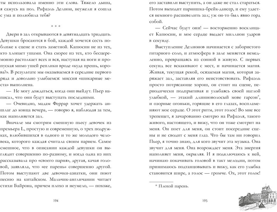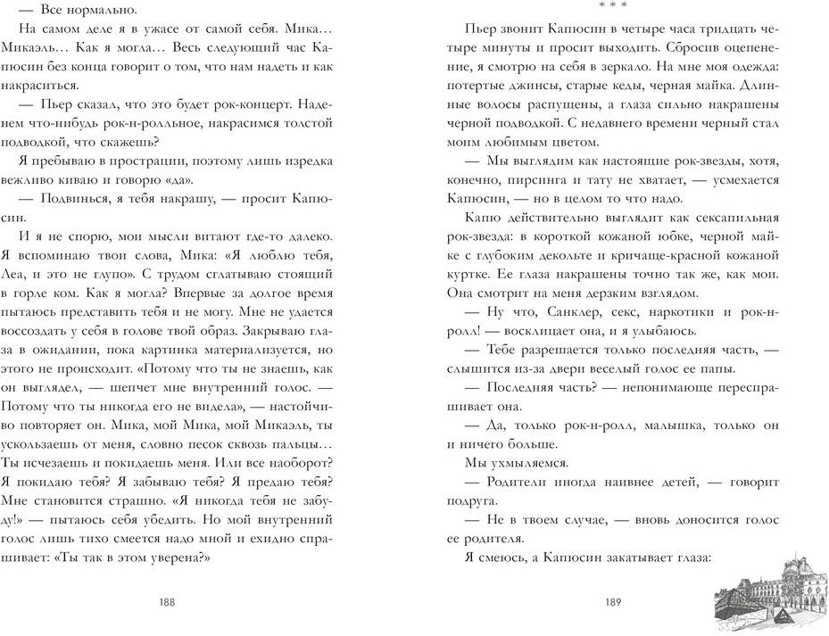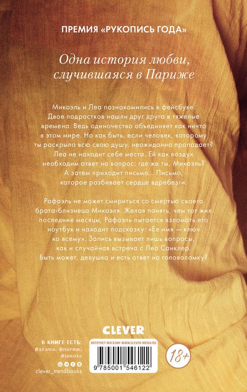 Новая книга Даны Делон, автора бестселлера «Шестое чувство». История одной любви, случившейся в Париже, от восходящей звезды французской прозы. Микаэль и Леа познакомились в фейсбуке. Двое подростков нашли друг друга в тяжелые времена. Ведь одиночество объединяет как ничто в этом мире. Но как быть, если человек, которому ты раскрыла свою душу, неожиданно пропадает? Леа не находит себе места. Ей как воздух необходим ответ на вопрос: где же ты, Микаэль? А затем приходит письмо... письмо, которое разбивает сердце вдребезги. Рафаэль не может смириться со смертью своего брата-близнеца Микаэля. Желая понять, чем тот жил последние месяцы, он пытается взломать его ноутбук и находит подсказку: «Ее имя — ключ ко всему». Запись вызывает больше вопросов, чем ответов, как и случайная встреча с Леа Санклер. Быть может, девушка и есть ответ на головоломку? Книга отмечена премией «Рукопись года». |