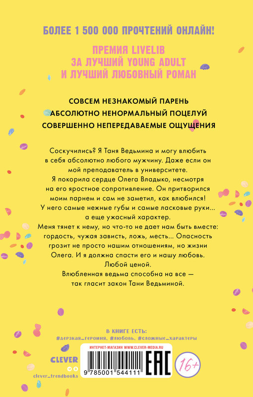 Роман «Влюбленная ведьма» — бестселлер для подростков (16+) и для взрослых, он станет чудесным подарком или замечательным дополнением к подарочному комплекту (набору) на день рождения, 8 Марта, День святого Валентина (14 февраля), Новый год (НГ) и любой другой праздник. Книга понравится любимой девушке, женщине, подруге, сестре, маме, тем, кто с удовольствием читает современную художественную литературу, ценит качественную прозу и романтические книги от редакции Trendbooks.