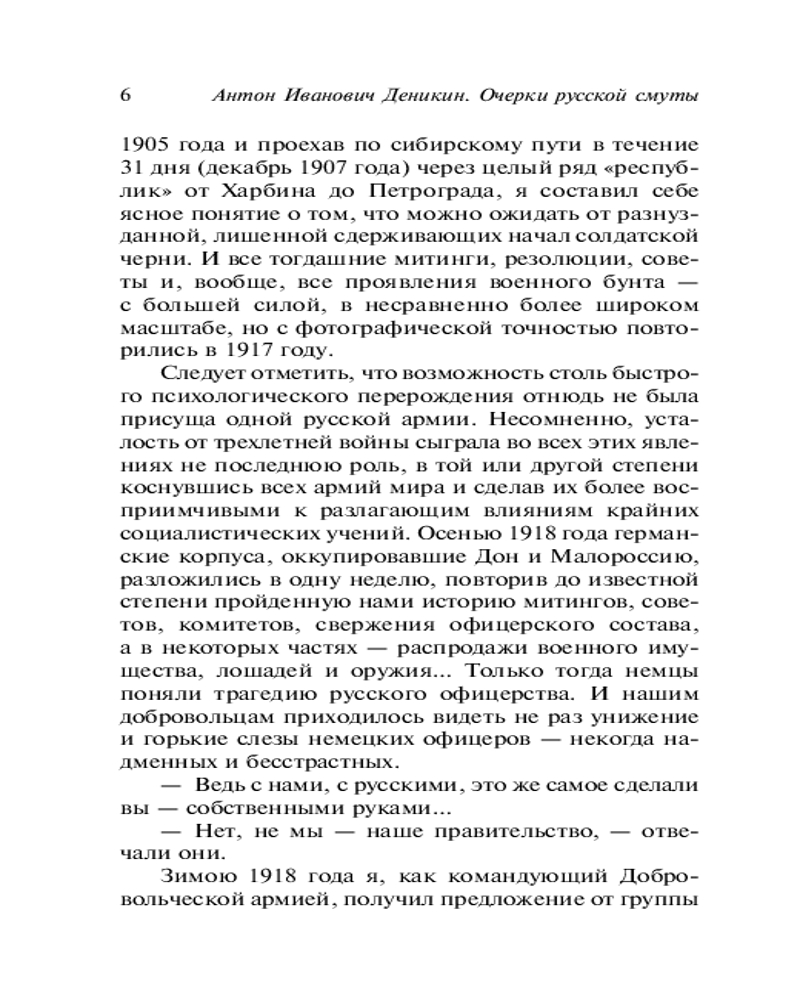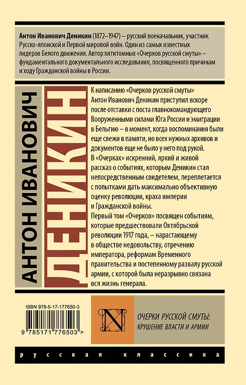 Серия: Эксклюзив: Русская классика К написанию «Очерков русской смуты» Антон Иванович Деникин приступил вскоре после отставки с поста главнокомандующего Вооруженными силами Юга России и эмиграции в Бельгию — в момент, когда воспоминания были еще свежи в памяти, но всех нужных архивов и документов еще не было под рукой у автора. В «Очерках» искренний, яркий и живой рассказ о событиях, которым Деникин стал непосредственным свидетелем, переплетается с попытками дать беспристрастную и, насколько это возможно, объективную оценку краха Империи, революции и Гражданской войны. |