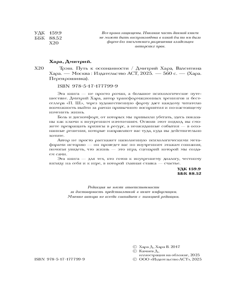 Серия: Хара. Перепрошивка Эта книга — психологическое путешествие, которое помогает выйти из тупика и увидеть новые горизонты. Дмитрий Хара, автор трансформационных тренингов и бестселлера «П. Ш.», через художественный сюжет помогает выбраться из состояния, когда всё кажется бессмысленным, когда боль и разочарования лишают сил, а будущее кажется туманным и неопределенным. Вместо сухих советов из книг по психологии — история, наполненная метафорами и смыслами, которые незаметно работают с вашим мышлением. |