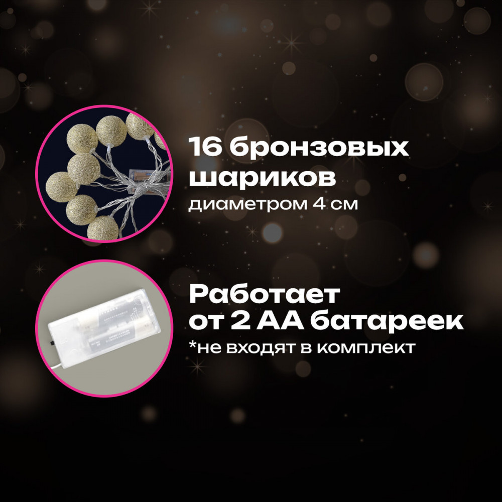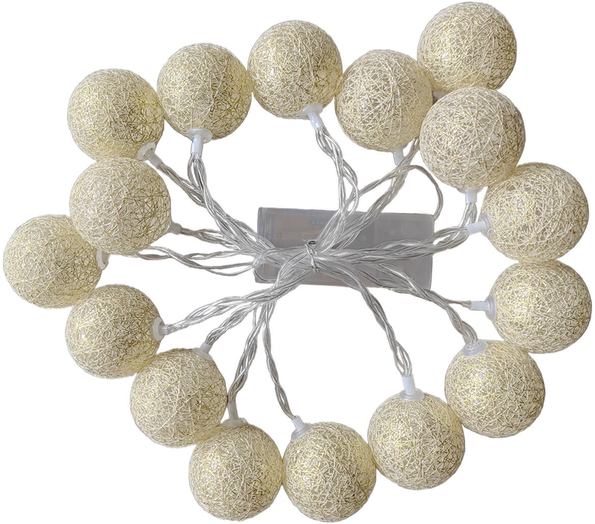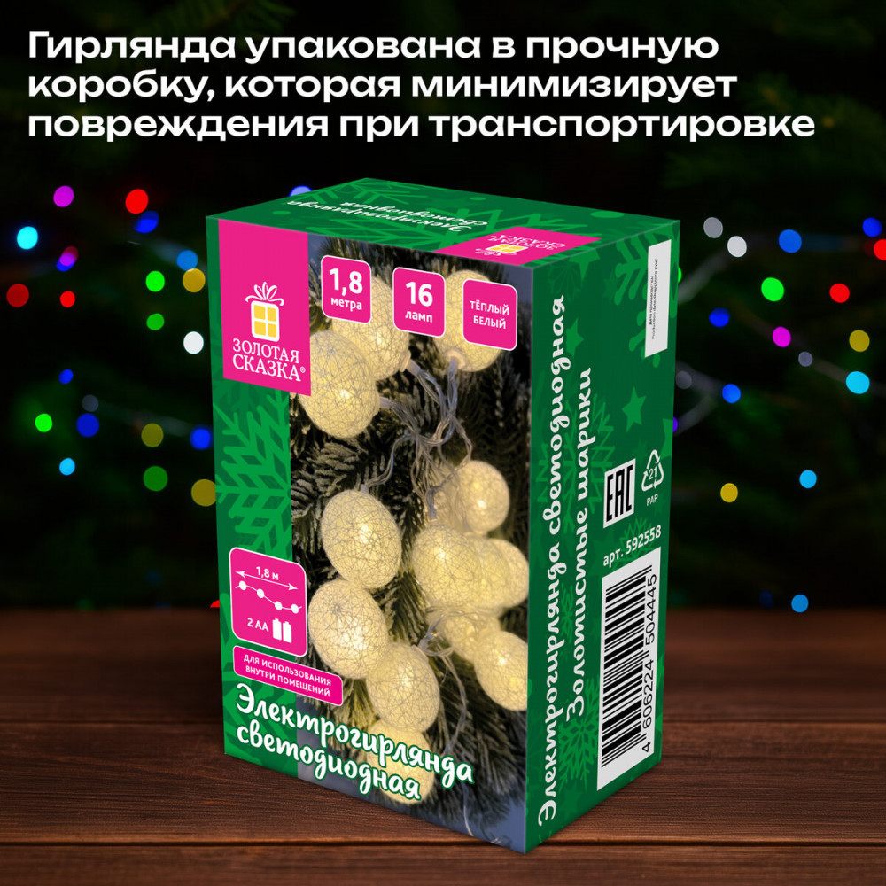 Гирлянда порадовала. Шарики из золотистой люрексовой нити диаметром 4,5 см. Провод прозрачный. Выключатель работает на 2 батарейках и только в режимах «вкл» и «выкл».упаковано в хорошую коробку. Можно даже в подарок такую вещь брать, выглядит очень прилично. Буду кще заказывать. Очень довольна.