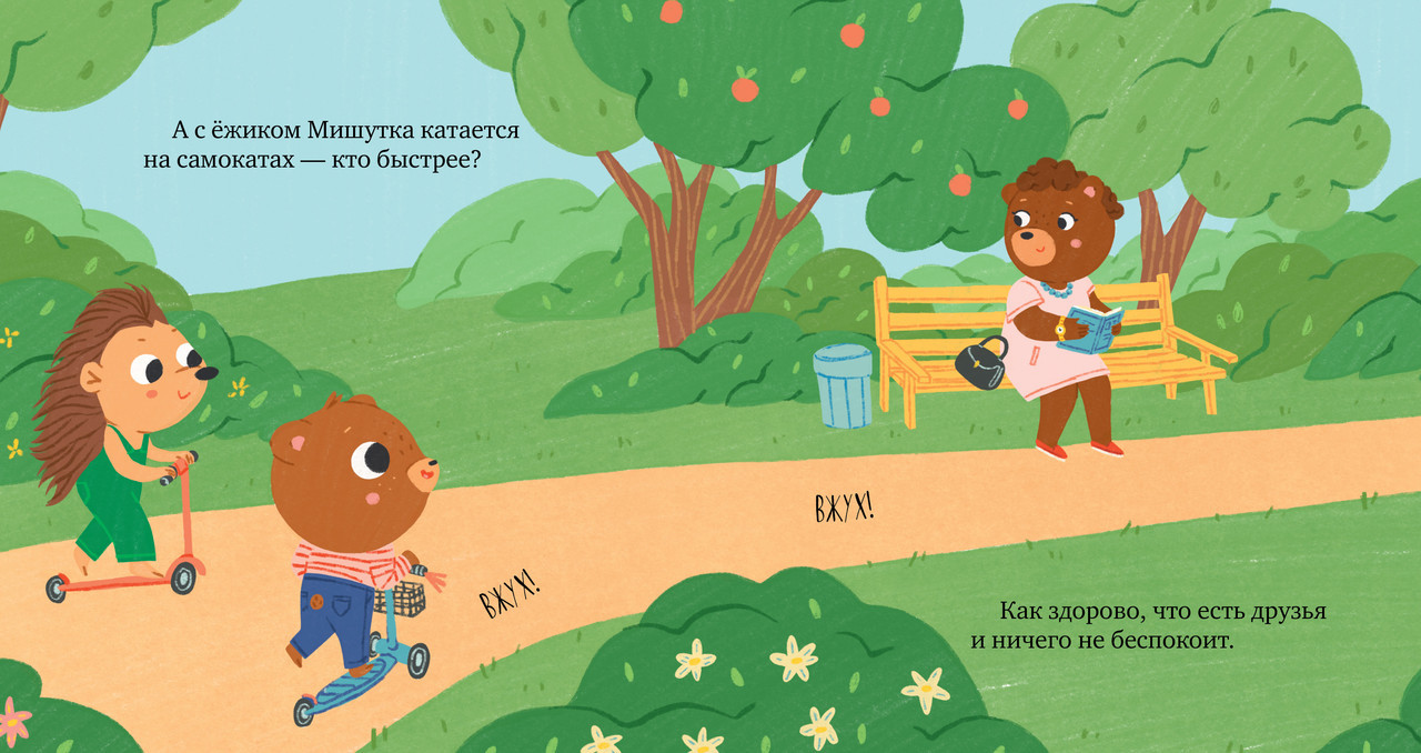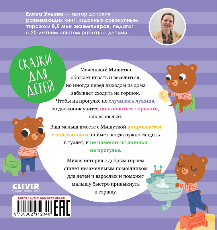 Маленький Мишутка обожает играть и веселиться, но иногда перед выходом из дома забывает сходить на горшок. Чтобы на прогулке не случилась лужица, медвежонок учится пользоваться горшком, как взрослый. Ваш малыш вместе с Мишуткой попрощается с подгузником, поймёт, когда нужно сходить в туалет, и не намочит штанишки на прогулке. Милая история с добрым героем станет незаменимым помощником для детей и взрослых и поможет малышу быстро привыкнуть к горшку. |
