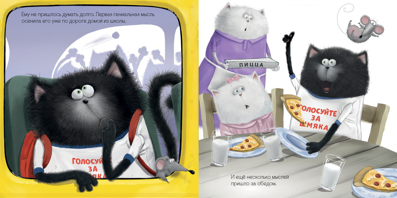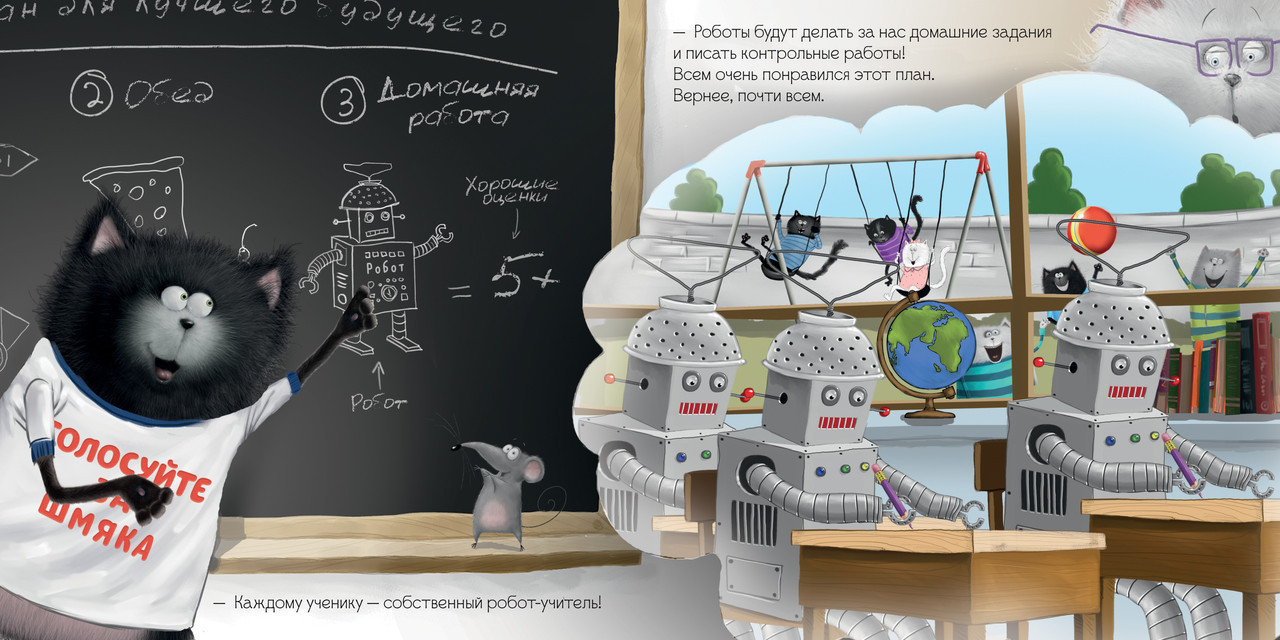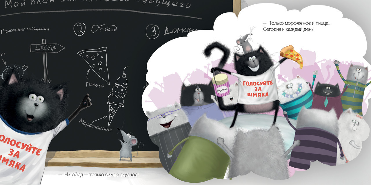 Шмяка выбрали в президенты ученического совета. Котенок решил дать громкие обещания всему классу, теперь они будут приезжать в школу на гоночных автомобилях, есть пиццу и мороженое, а домашнюю работу за них сделают роботы. Вот только Шмяк не подумал, чем грозят такие обещания. Кажется, ему придется придумать что-то другое. Как он выкрутится из этой ситуации? Шмяк — один из самых любимых героев маленьких читателей. |