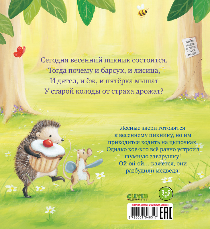 Невероятно смешная книжка-картинка про лесных зверей, дружбу и весну! Увлекательная книга «Чур, медведя не будить!» с веселыми стихами и очаровательными иллюстрациями поведает детям о трудностях зверей, которые собрались устроить пикник, но кое-что большое и страшное им мешает. Ни толком стол накрыть, ни потереть ушибленное место, ни повеселиться на славу зверята не могут — очень боятся потревожить медведя. Ведь разбуженный громила очень опасен! И все же никакие предосторожности не спасли друзей от пробуждения медведя. Что они ему скажут, чтобы успокоить, и чем закончится весенний пикник, вы узнаете только в конце истории. Детская книга хороша для первого самостоятельного чтения, развития речи, воображения и чувства юмора. |