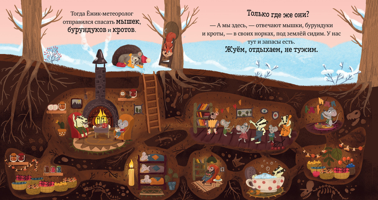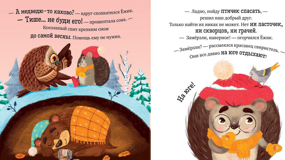 Это познавательная сказка с нежными иллюстрациями, которая познакомит малыша с самым холодным временем года, расскажет, что происходит в природе в это время и подарит настроение для прогулки по сугробам. Ежик — очаровательный малыш, который знакомится с окружающим миром. Завороженный красотой зимы и испуганный ее суровостью, Ежик отправляется проведать своих верных друзей: птичек, рыбок, жучков и паучков. Удастся ли им справиться со снежной зимой — это и предстоит узнать Ежику. Книга в форме увлекательной сказки поделится с ребенком первыми научными знаниями: как определять время года по его приметам, почему надо одеваться по погоде, как различать зверей, птиц и растения, которые встречаются зимой, расскажет об основных природных явлениях и смене сезонов. А когда малыш подрастет, книга станет проводником в удивительный мир самостоятельного чтения: крупный шрифт, короткие абзацы, выделенные слова помогут сделать первые читательские шаги. |