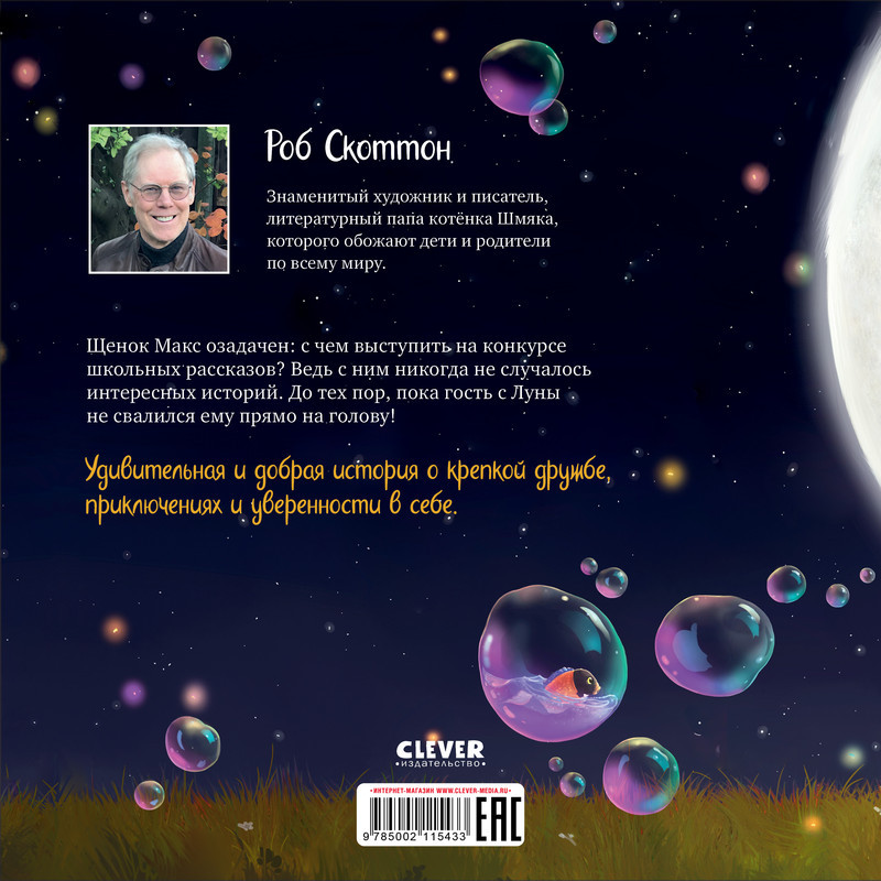 Новая книга от создателя котенка Шмяка, которого любят дети и взрослые во всем мире. "Макс и Лунный Боб"— добрая история о крепкой дружбе, приключениях и уверенности в себе. Очаровательный пушистый герой наверняка понравится малышам, а большие иллюстрации в неповторимом стиле Роба Скоттона захочется рассматривать снова и снова. Щенок Макс озадачен: с чем выступить на конкурсе школьных рассказов? Ведь с ним никогда не случалось интересных историй. До тех пор, пока гость с Луны не свалился ему прямо на голову! Макс, а вместе с ним и маленький читатель, узнают: иногда для того, чтобы поверить в себя, нужен верный друг... для которого ты лучше всех во Вселенной. Книга отлично подойдет как для совместного, так и для первого самостоятельного чтения. За простыми словами и короткими предложениями книг Роба Скоттона скрываются трогательные истории о настоящей дружбе.