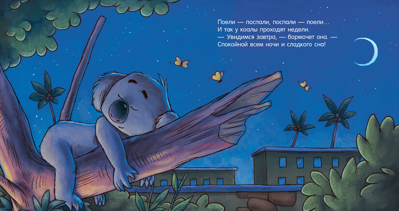 Маленькая коала и другие обитатели зоопарка собираются спать и помогут заснуть мальчикам и девочкам. Малышка-коала поела листьев и засыпает, уцепившись за ветку дерева. Львята играли весь день, но вот мама-львица забрала их, чтобы уложить спать. Кенгуру устала, уснули жирафы, бегемоты, зевает уставший слон. Луна выглянула на небе и пожелала всем сладких снов!