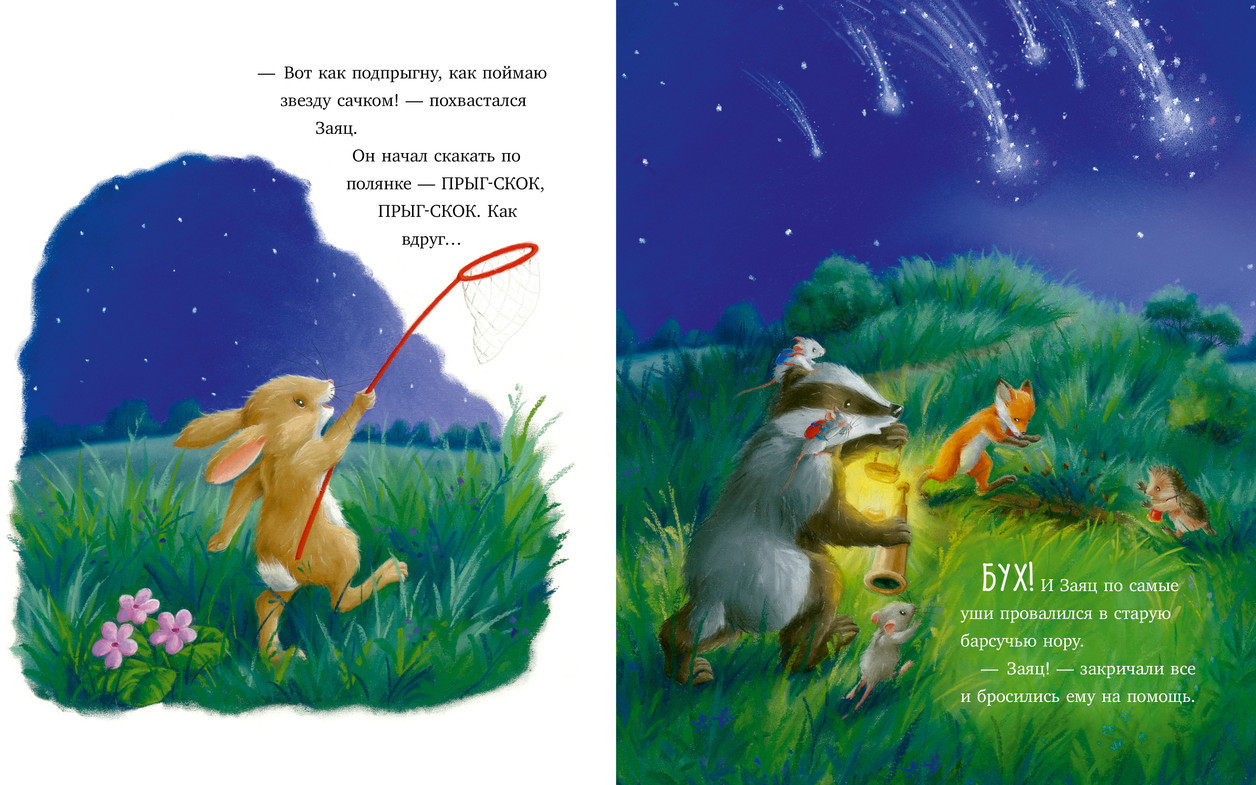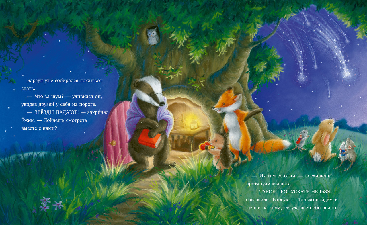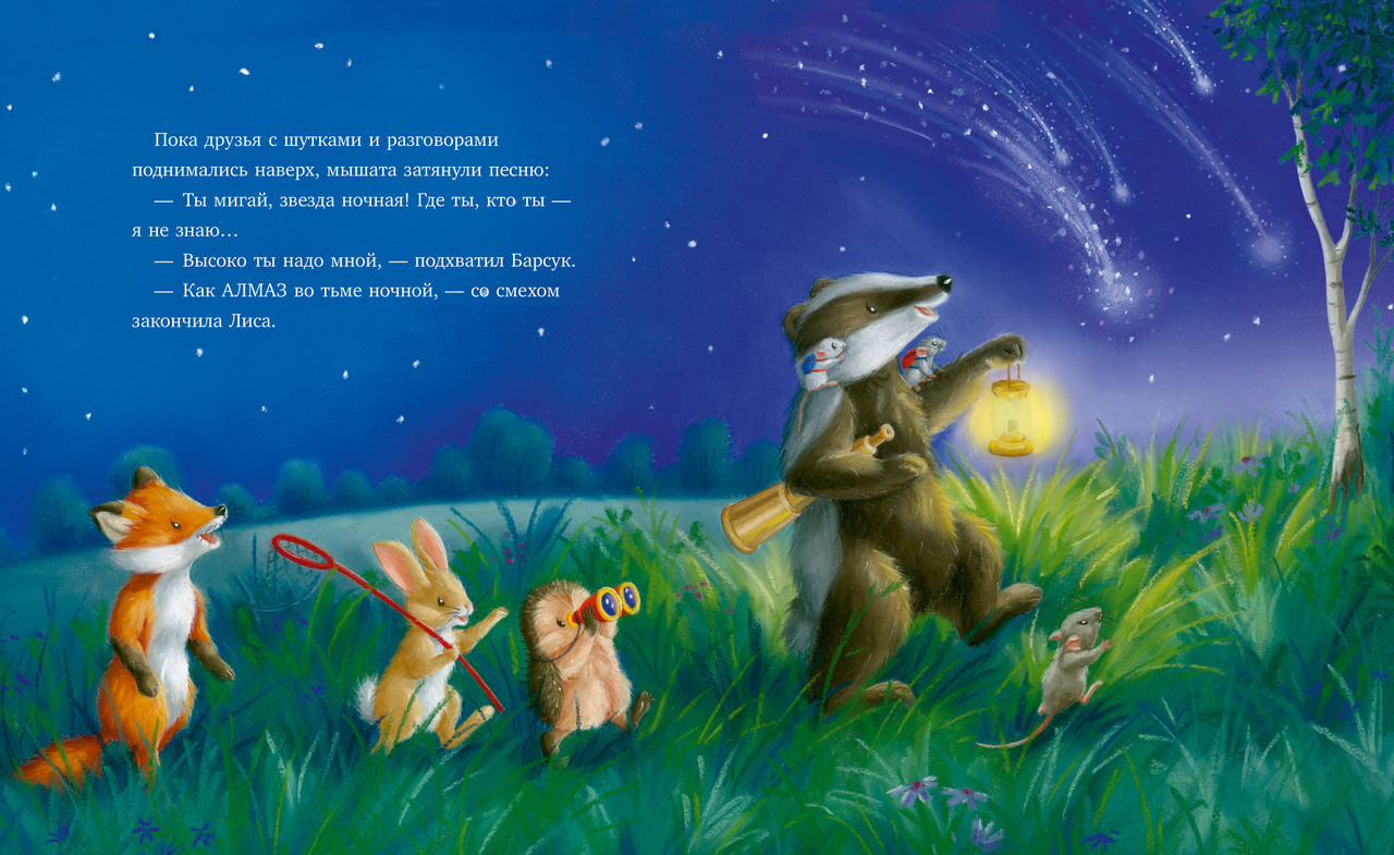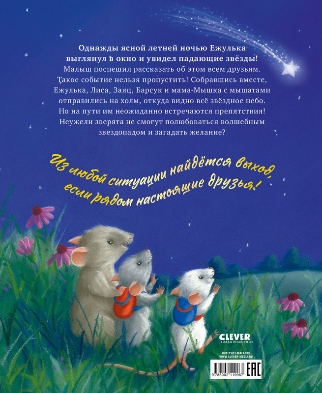 Серия: Приключения Ежульки Для тех, кто любит читать детям вслух и рассматривать с маленькими читателями красивые иллюстрации, книжка-картинка «Самая звездная ночь» станет прекрасным семейным чтением. Сюжет увлечет малышей 3, 4, 5 лет. Очаровательный Ежулька хочет посмотреть на звездопад, он приглашает Лису, Барсука, Зайца и маму-Мышку подняться вместе с ним на холм, откуда видно все небо! Но, кажется, не так просто увидеть падающие звезды, чтобы загадать желание. Кто поможет Ежульке преодолеть препятствия на пути к мечте? Конечно, друзья!