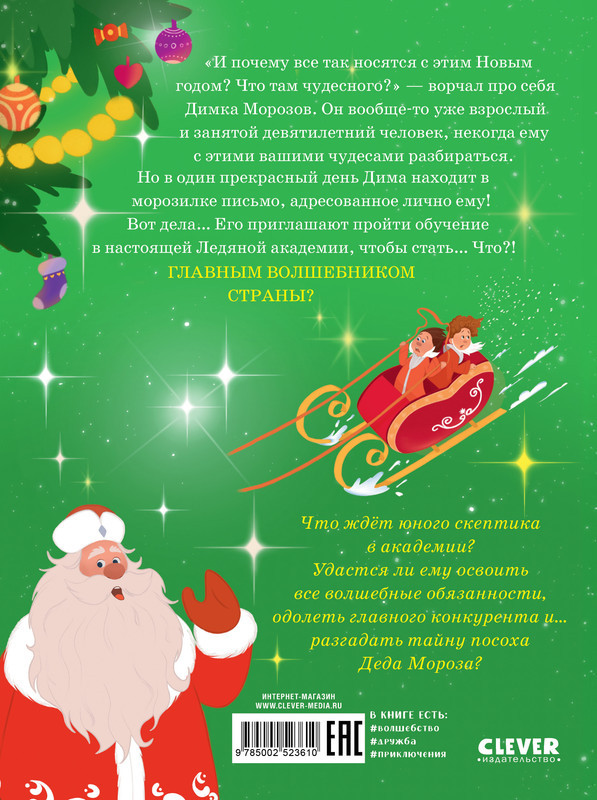 «И почему все так носятся с этим Новым годом? Что там чудесного?» — ворчал про себя Димка Морозов. Он вообще‑то уже взрослый и занятой девятилетний человек, некогда ему с этими вашими чудесами разбираться. Но в один прекрасный день Дима находит в морозилке письмо, адресованное лично ему! Вот дела... Его приглашают пройти обучение в настоящей Ледяной академии, чтобы стать... Что?! Главным волшебником страны? Что ждёт юного скептика в академии? Удастся ли ему освоить все волшебные обязанности, одолеть главного конкурента и... разгадать тайну посоха Деда Мороза? |