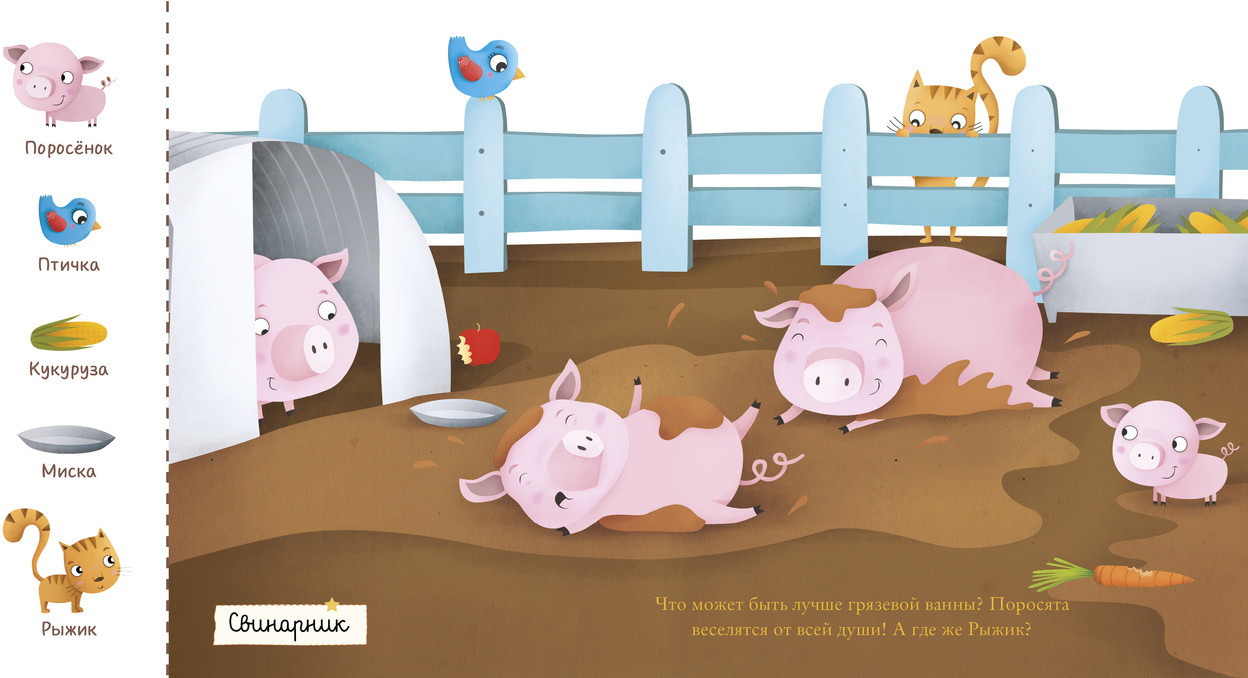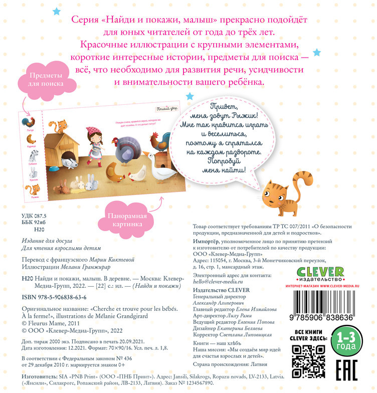 💳 Оплатить за товар можно при получении 🇰🇿 Есть бесплатная доставка по Казахстану от 1 дня 🎁 Копите бонусы с каждой покупки Серия: Найди и покажи, малыш Красочные иллюстрации с крупными элементами, короткие интересные истории, предметы для поиска — все, что необходимо для развития ребенка и веселой игры! Каждая страница — это целый мир, в котором нужно найти 5 спрятанных предметов. Пока ребенок рассматривает картинки, он будет знакомиться с окружающими его предметами, многие из которых он с легкостью узнает. Здесь можно познакомиться с овечкой или лошадкой, посмотреть, как живут куры и кролики. И не забудьте, что один симпатичный герой проведет вас через всю книжку! Его нужно будет найти и показать на каждом развороте. |