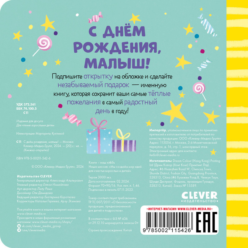 💳 Оплатить за товар можно при получении 🇰🇿 Есть бесплатная доставка по Казахстану 🎁 Копите бонусы с каждой покупки Серия: Книжка-открытка Книжка-открытка «С днем рождения, малыш!» — это идеальный способ поздравить ребенка в его первый большой праздник. Подпишите карточку на обложке и сделайте незабываемый подарок — именную книгу, которая сохранит ваши теплые пожелания в самый радостный день в году. Внутри книжки ждут уютные иллюстрации и трогательные пожелания, к которым малышу будет приятно возвращаться год за годом. Читайте их вместе, как сказку, чтобы разделить друг с другом самые трепетные, нежные и значимые моменты. Книжка создана для маленьких детских ручек: плотные картонные страницы не помнутся и не порвутся, а скругленные уголки не поранят пальчики. |
