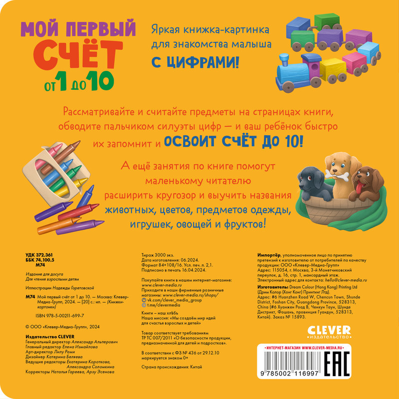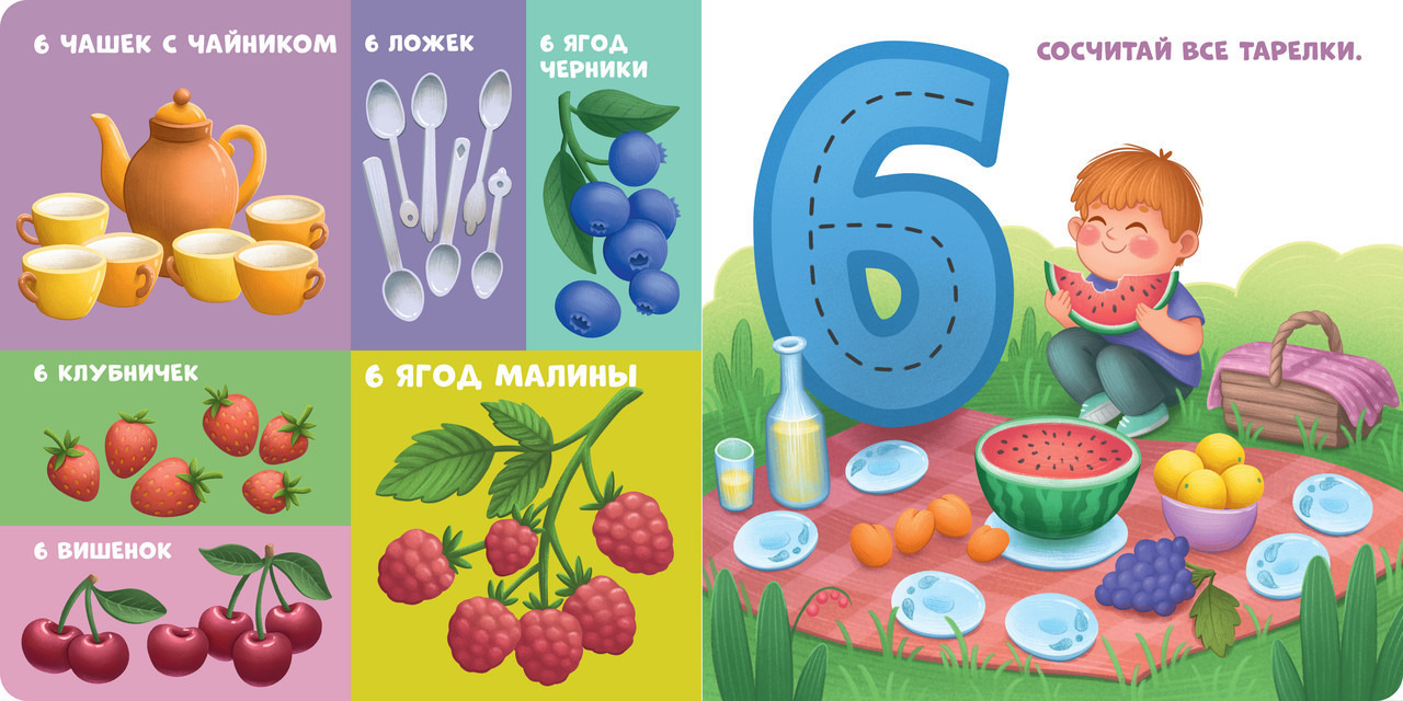 Серия: Книжки-картонки Развивающая книжка из плотного картона «Мой первый счет от 1 до 10» познакомит ребенка с основами счета, а заодно послужит хорошим поводом повторить цвета и узнать множество новых слов. На каждом развороте книжки ребенок будет узнавать новое число, обводить пальчиком цифры, считать предметы и отвечать на вопросы. Яркие обучающие картинки наглядно знакомят малыша с окружающим миром. Кроме этого, регулярные занятия основами математики помогают в развитии логики, внимания и памяти. Книгу можно спокойно давать ребенку для самостоятельного изучения — плотные картонные страницы с закругленными уголками абсолютно безопасны для детей. |