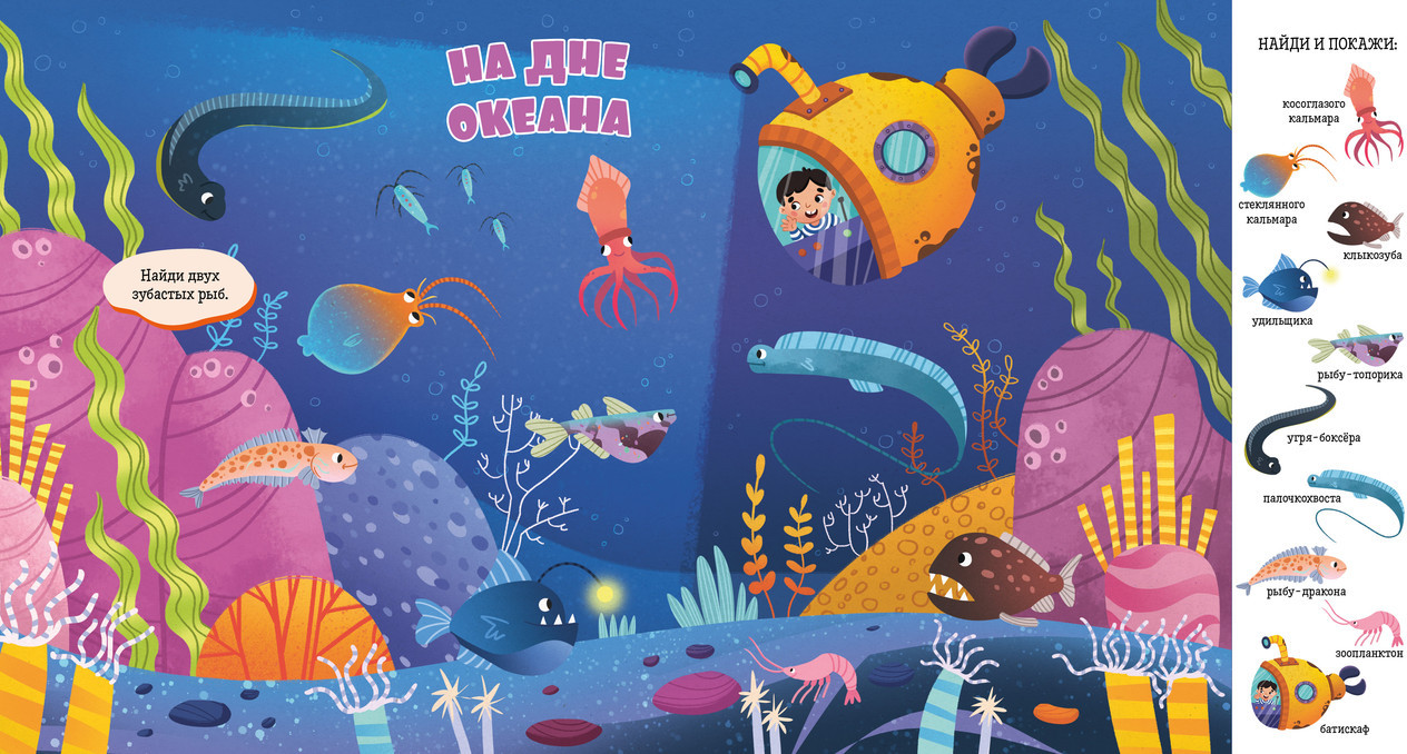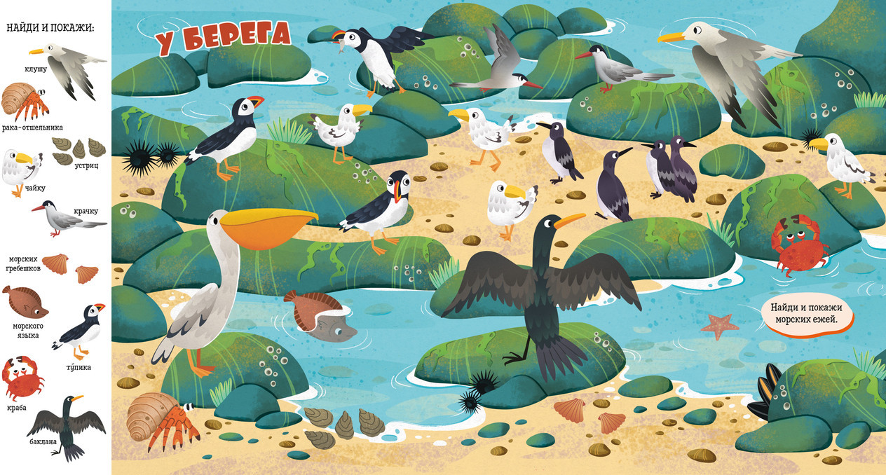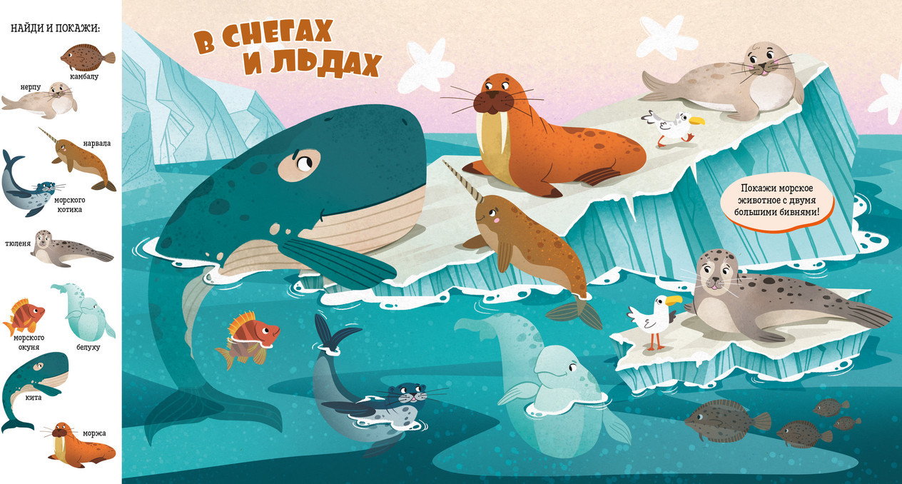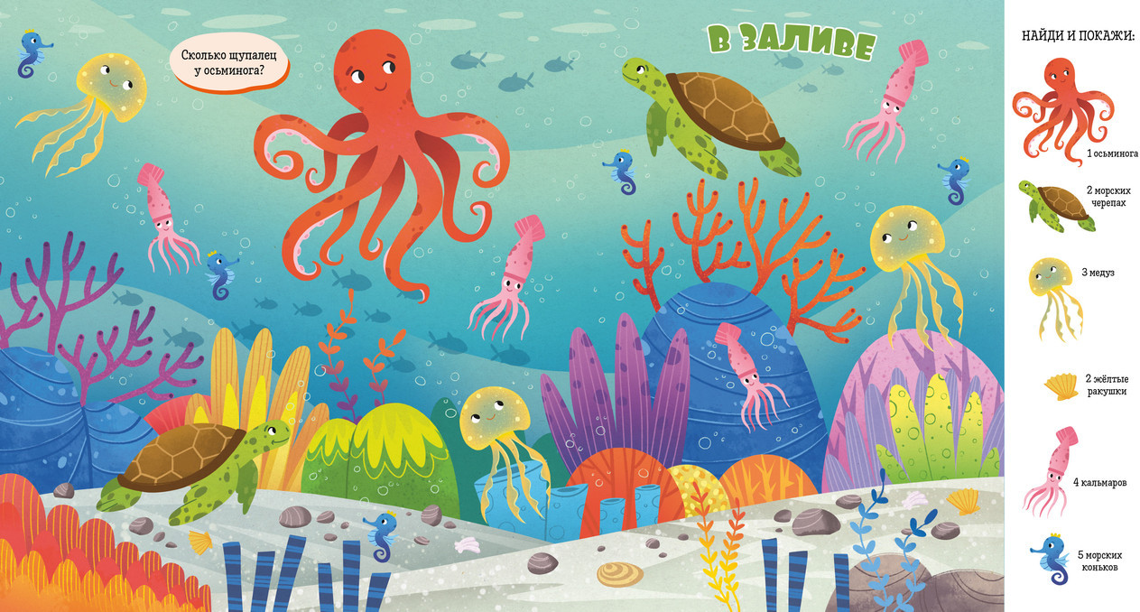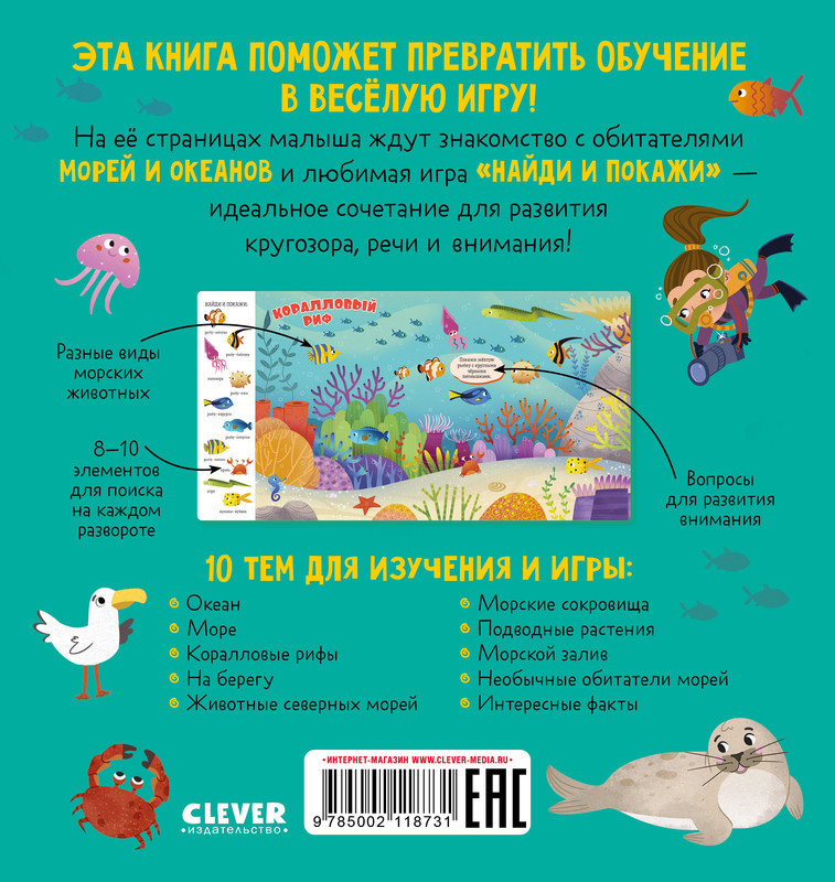Серия: Найди и покажи, малыш Книга «Найди и покажи, малыш. Океаны и моря» — виммельбух с яркими панорамными разворотами, на страницах которого малышей ждет увлекательное путешествие в подводный мир и знакомство с его обитателями. Забавные иллюстрации Юлии Ершовой, задания на внимательность и сообразительность в формате «найди и покажи», интересные факты — все это поможет ребенку быстро запомнить разные виды морских животных, расширить кругозор и узнать больше об окружающем мире. Регулярные занятия с книжкой способствуют развитию моторики, речи, внимания и памяти ребенка. Красочная познавательная книжка в твердом переплете с плотными страницами «Найди и покажи, малыш. Океаны и моря» — идеальный подарок для детей на день рождения и любой другой праздник. Она надолго увлечет ребенка во время долгой дороги или перелета, а кроме того, книжку можно взять с собой на прогулку или в детский сад, чтобы играть вместе с друзьями. |