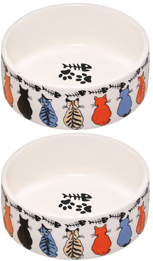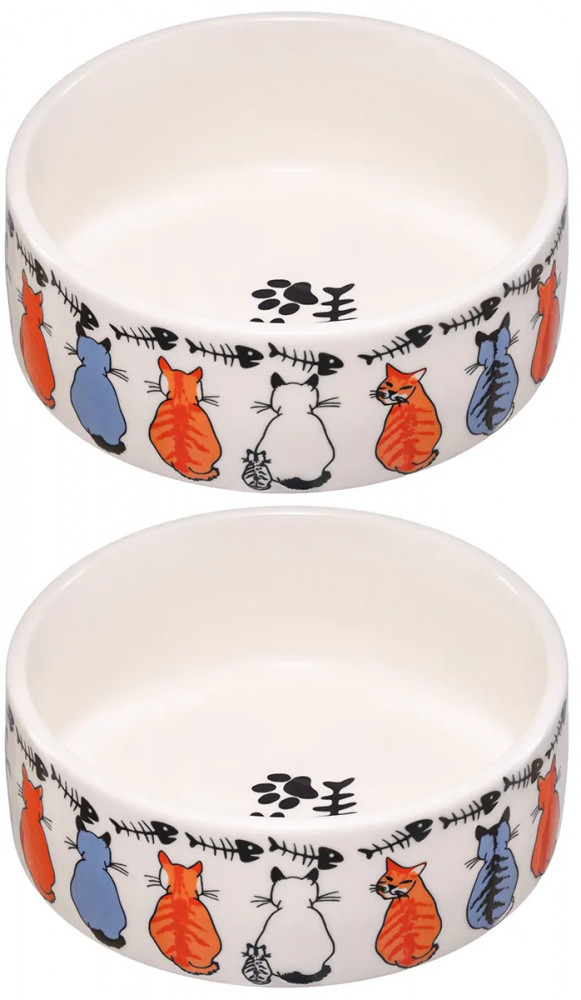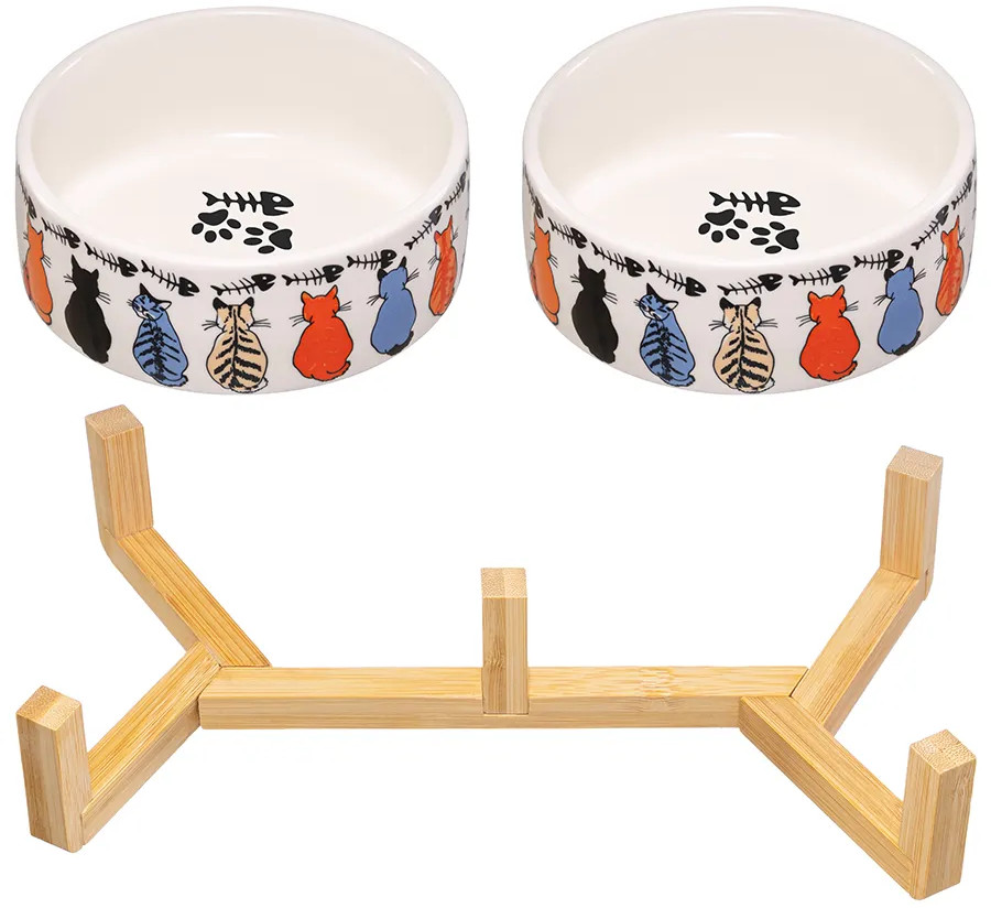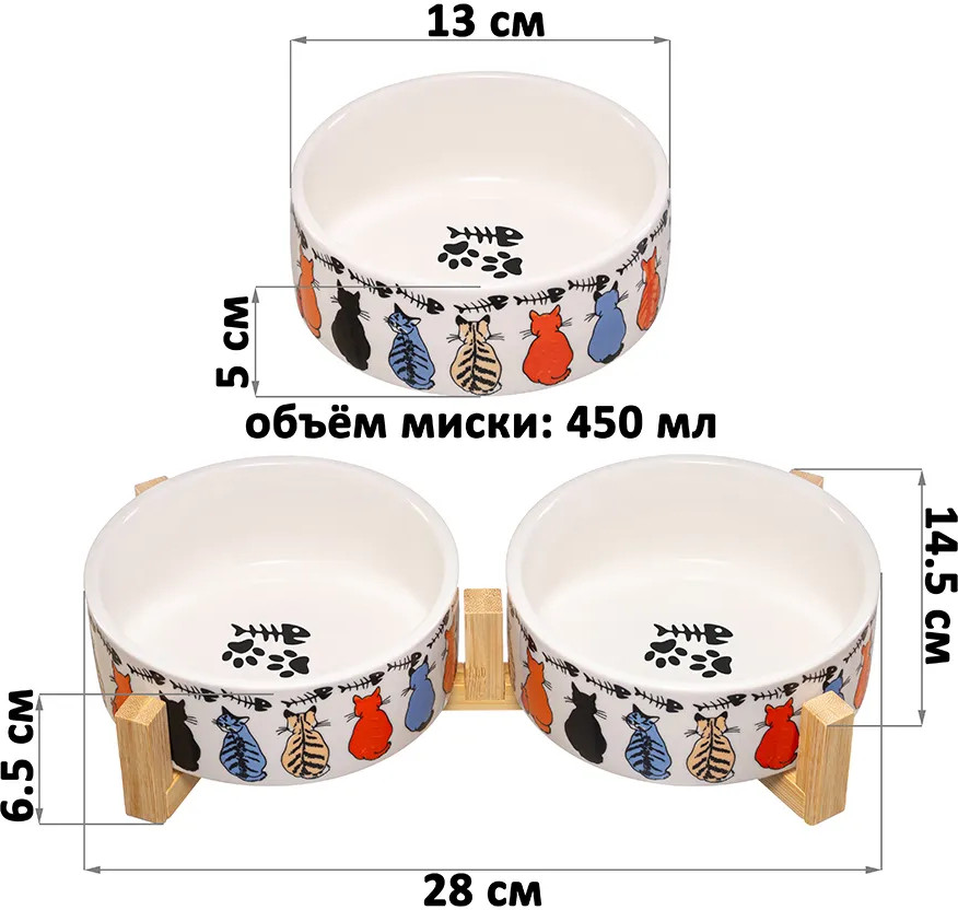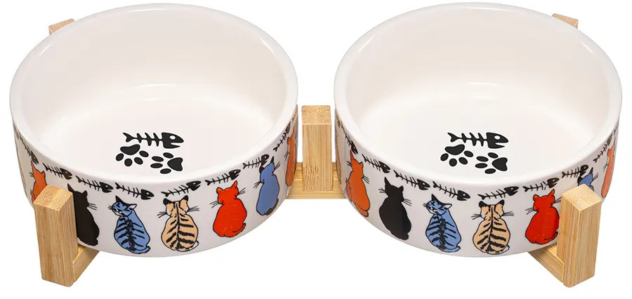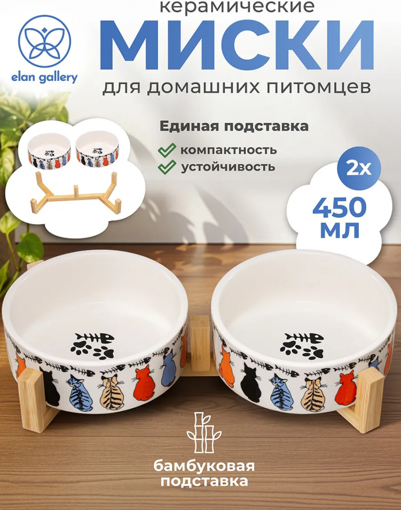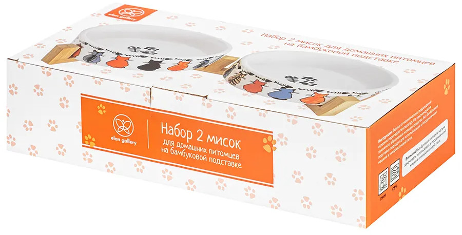 Набор 2 мисок для домашних животных на бамбуковой подставке от Elan Gallery подойдёт для котов, собак мелких пород и других питомцев. Размер комплекта с подставкой — 28×14,5×6,5 см. Размер каждой ёмкости — 13×13×5 см, объём — 450 мл. Выполнены из керамики, безопасной для здоровья и не выделяющей вредных веществ. В отличие от металлической посуды, керамические изделия не впитывают запах, что особенно важно для животных из-за хорошего обоняния. Они гипоаллергенны и легко отмываются, что делает их удобными в повседневном использовании. Белые мисочки украшены рисунком в виде милых ярких котиков. На дне расположены рисунки в виде кошачьих лапок и рыбки. Декоративный комплект подойдёт как владельцам нескольких животных, так и для раздельного хранения сухого и влажного корма. Благодаря глубокой форме ёмкости также можно использовать для воды в качестве поилок. Бамбуковая подставка обеспечит устойчивость и предотвратит повреждение изделий. Расположите набор на кухне или в любом другом подходящем месте в доме. |
