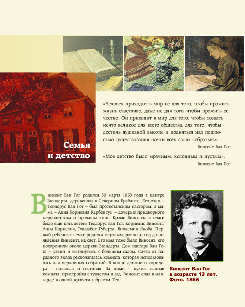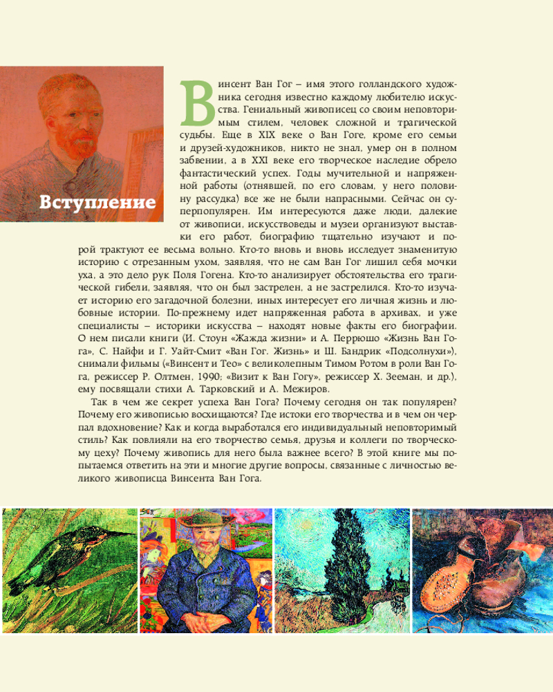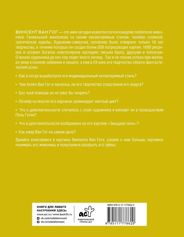 Серия: Искусство понимать Винсент Ван Гог — это имя сегодня известно почти каждому любителю живописи. Гениальный живописец со своим неповторимым стилем, человек сложной трагической судьбы. Художник-самоучка, которому было отмерено только 7 лет творчества, в течение которых он создал более потрясающих 800 картин и 1000 рисунков. Эпистолярное наследие Винсента Ван Гога включает в себя более семисот писем, которые открывают нам правду о жизни художника, чье искусство оставалось безвестным при его жизни и признано бесценным в наши дни. О жизни художника до сих пор ходит много легенд. Так и не познав успеха при жизни, он умер в полном забвении, оставив нам множество загадок, а уже в XXI веке его творческое наследие обрело фантастический успех. Давайте всмотримся в картины Винсента Ван Гога, узнаем о нем больше, научимся понимать его живопись и попытаемся раскрыть его тайны. |