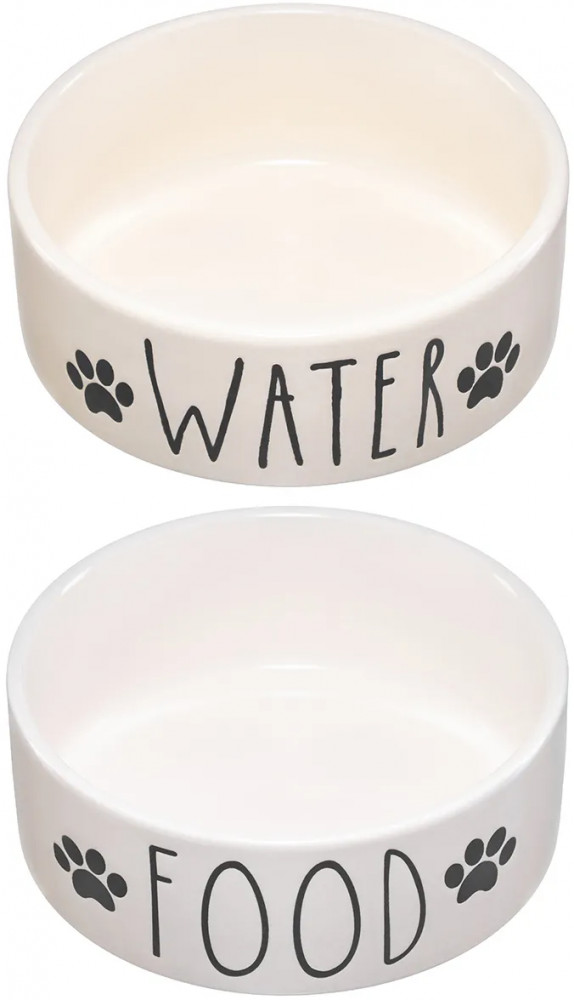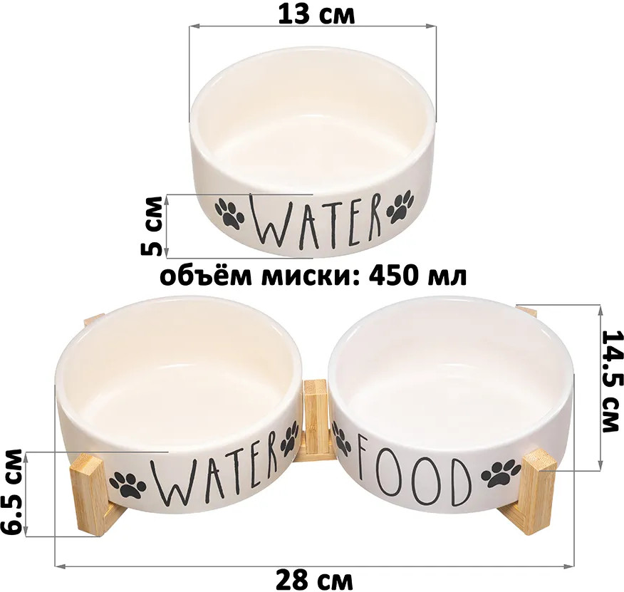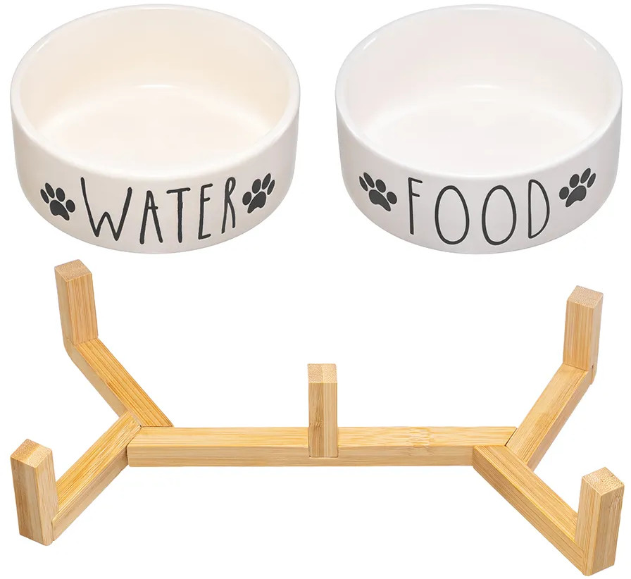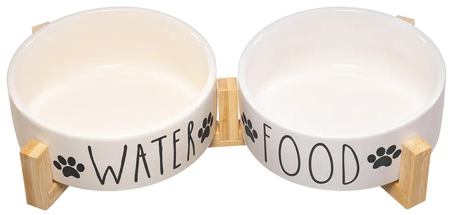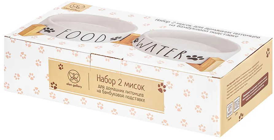 Набор 2 мисок для домашних животных на бамбуковой подставке от Elan Gallery подойдёт для котов, собак мелких пород и других питомцев. Размер комплекта с подставкой — 28×14,5×6,5 см. Размер каждой ёмкости — 13×13×5 см, объём — 450 мл. Выполнены из керамики, безопасной для здоровья и не выделяющей вредных веществ. В отличие от металлической посуды, керамические изделия не впитывают запах, что особенно важно для животных из-за хорошего обоняния. Они гипоаллергенны и легко отмываются, что делает их удобными в повседневном использовании. Бежевые мисочки украшены надписями «Food» («Корм») и «Water» («Вода») и рисунками лапок. Декоративный комплект подойдёт как владельцам нескольких животных, так и для раздельного хранения сухого и влажного корма. Благодаря глубокой форме ёмкости также можно использовать для воды в качестве поилок. Бамбуковая подставка обеспечит устойчивость и предотвратит повреждение изделий. Расположите набор на кухне или в любом другом подходящем месте в доме.