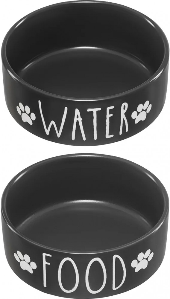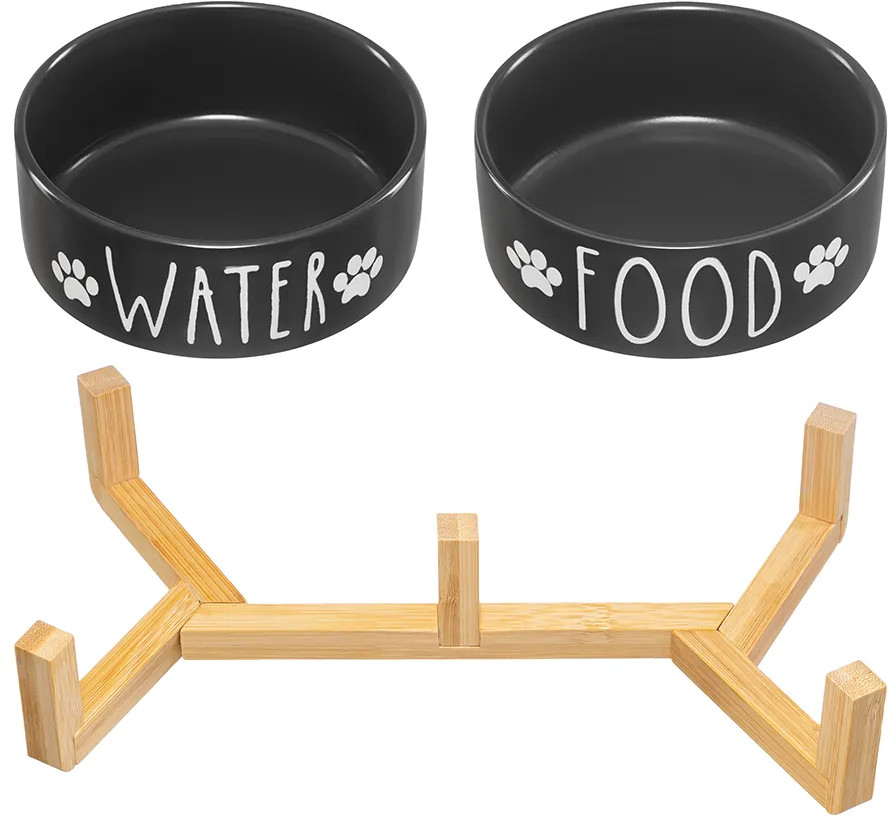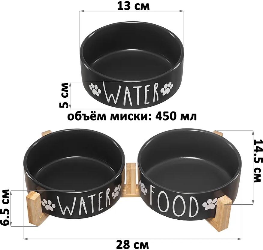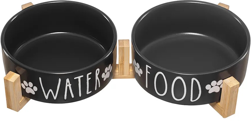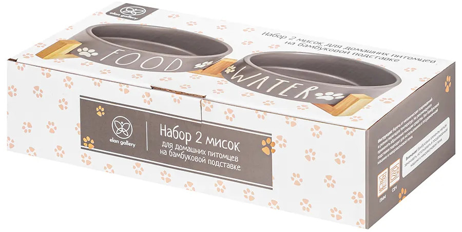 Набор 2 мисок для домашних животных на бамбуковой подставке от Elan Gallery подойдёт для котов, собак мелких пород и других питомцев. Размер комплекта с подставкой — 28×14,5×6,5 см. Размер каждой ёмкости — 13×13×5 см, объём — 450 мл. Выполнены из керамики, безопасной для здоровья и не выделяющей вредных веществ. В отличие от металлической посуды, керамические изделия не впитывают запах, что особенно важно для животных из-за хорошего обоняния. Они гипоаллергенны и легко отмываются, что делает их удобными в повседневном использовании. Бежевые мисочки украшены надписями «Food» («Корм») и «Water» («Вода») и рисунками лапок. Декоративный комплект подойдёт как владельцам нескольких животных, так и для раздельного хранения сухого и влажного корма. Благодаря глубокой форме ёмкости также можно использовать для воды в качестве поилок. Бамбуковая подставка обеспечит устойчивость и предотвратит повреждение изделий. Расположите набор на кухне или в любом другом подходящем месте в доме.