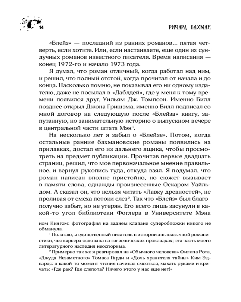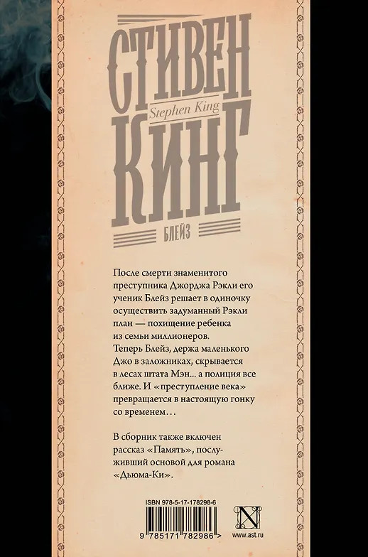 Серия: Кинг: книжная полка После смерти знаменитого преступника Джорджа Рэкли его ученик Блейз решает в одиночку осуществить задуманный Рэкли план — похищение ребенка из семьи миллионеров. Теперь Блейз, держа маленького Джо в заложниках, скрывается в лесах штата Мэн... а полиция все ближе. И «преступление века» превращается в настоящую гонку со временем. В сборник также включен рассказ «Память», послуживший основой для романа «Дьюма-Ки». |