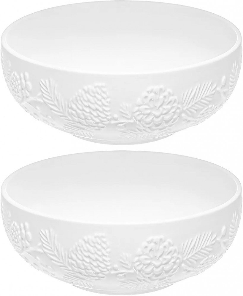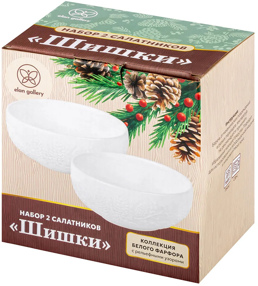 Набор 2 салатников Elan Gallery «Шишки» выполнен из белого фарфора. Размер каждого блюда — 16,5×16,5×6 см, объём — 800 мл. «Шишки» — это коллекция фарфоровой посуды, вдохновлённая атмосферой хвойного леса. Белоснежная поверхность изделий украшена утончённым рельефом веточек и шишек. Природные мотивы наполнят вашу сервировку уютом и ощущением светлого праздника. Подарите себе мгновения тишины и свежести — с дыханием леса и тонкой красотой в каждой детали.