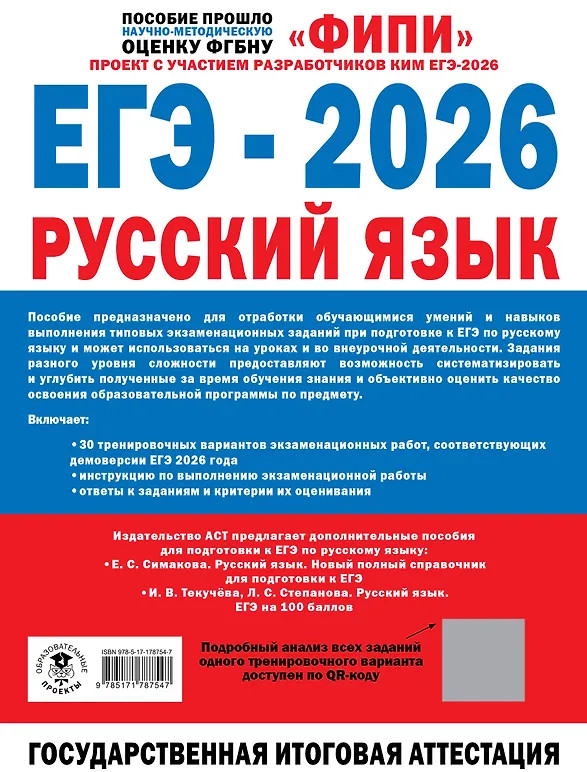 💳 Оплатить за товар можно при получении 🇰🇿 Есть бесплатная доставка по Казахстану от 1 дня 🎁 Копите бонусы с каждой покупки Серия: ФИПИ-школьникам Пособие прошло научно-методическую оценку ФГБНУ «ФИПИ». Проект с участием разработчиков КИМ ЕГЭ-2026. Пособие предназначено для отработки обучающимися умений и навыков выполнения типовых экзаменационных заданий при подготовке к ЕГЭ по русскому языку. Оно включает 30 тренировочных вариантов экзаменационных работ, соответствующих проекту демоверсии ЕГЭ 2026 года, инструкцию по их выполнению, ответы к заданиям и критерии их оценивания. Адресовано учителям для объективной оценки качества освоения образовательной программы по предмету и обучающимся для самоподготовки и самоконтроля. Может использоваться на уроке и во внеурочной деятельности. |