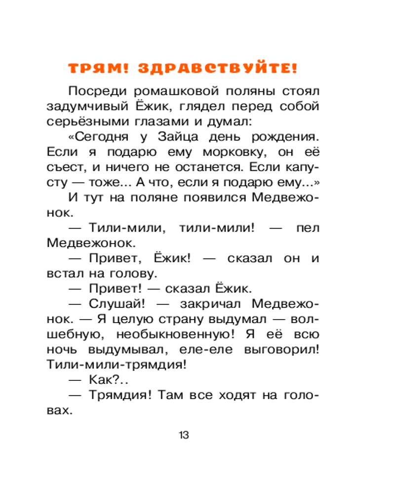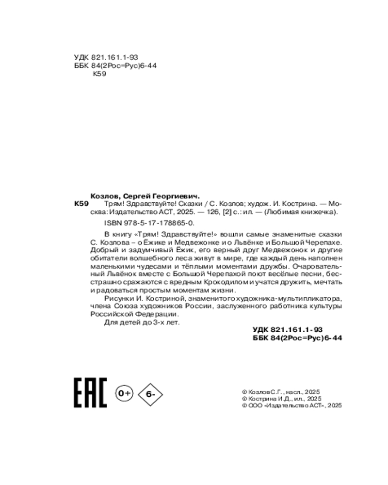 Серия: Любимая книжечка В книгу «Трям! Здравствуйте!» вошли самые знаменитые сказки С. Козлова — о Ёжике и Медвежонке и о Львёнке и Большой Черепахе. Добрый и задумчивый Ёжик, его верный друг Медвежонок и другие обитатели волшебного леса живут в мире, где каждый день наполнен маленькими чудесами и тёплыми моментами дружбы. Очаровательный Львёнок вместе с Большой Черепахой поют весёлые песни, бесстрашно сражаются с вредным Крокодилом и учатся дружить, мечтать и радоваться простым моментам жизни. Рисунки И. Костриной, знаменитого художника-мультипликатора, члена Союза художников России, заслуженного работника культуры Российской Федерации. |