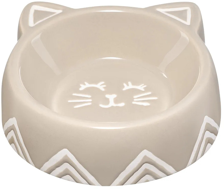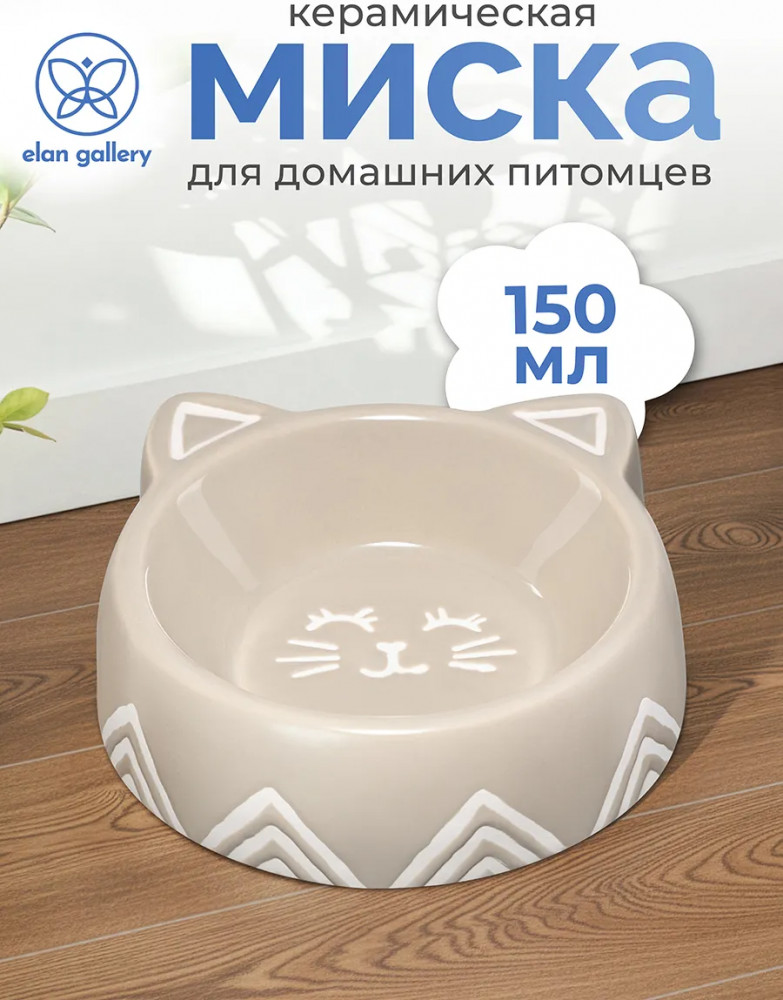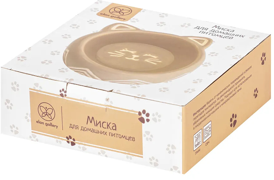 Миска для домашних животных от Elan Gallery. Размер ёмкости — 14×13,5×4,5 см, объём — 150 мл. Размер внутреннего дна — 7,5×7,5×3 см. Выполнена из керамики, безопасной для здоровья и не выделяющей вредных веществ. В отличие от металлической посуды, керамические изделия не впитывают запах, что особенно важно для животных из-за хорошего обоняния. Они гипоаллергенны и легко отмываются, что делает их удобными в повседневном использовании. Фигурная мисочка выполнена в виде кошачьей мордочки с ушками и рисунком на дне.