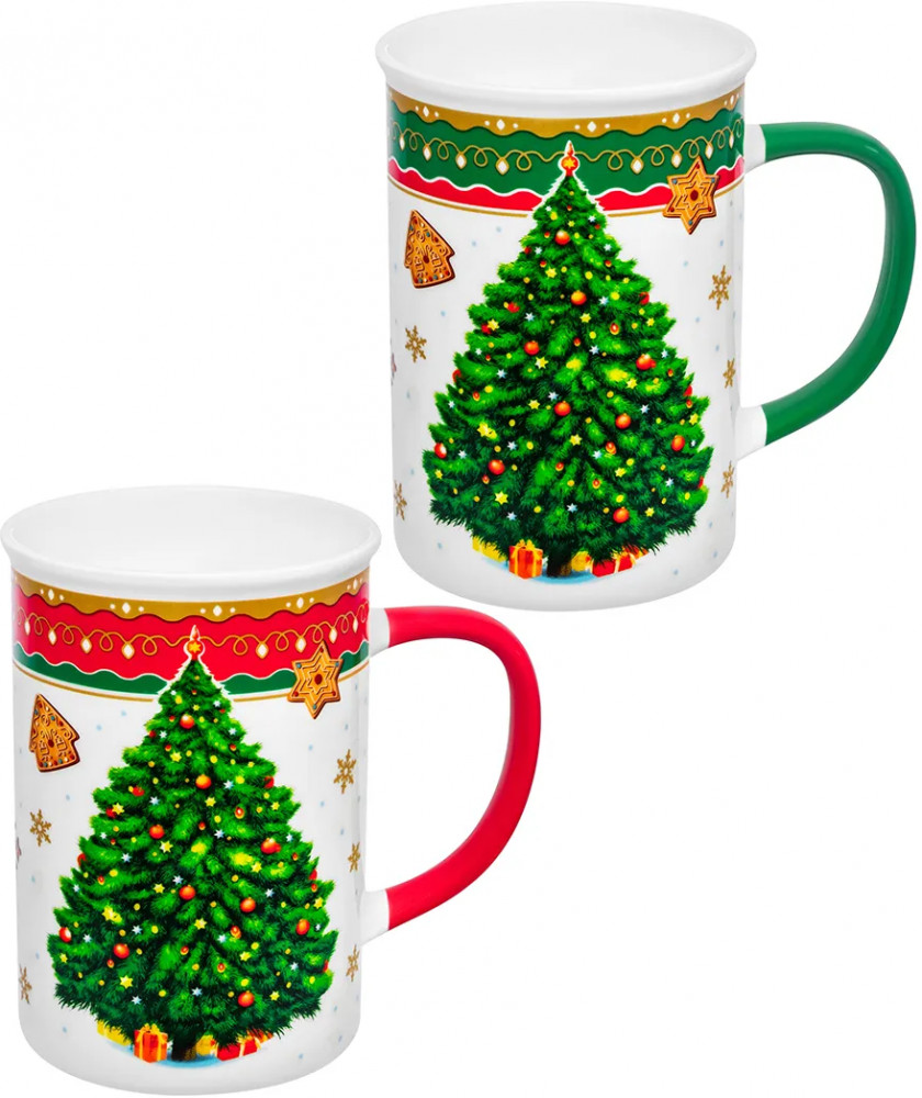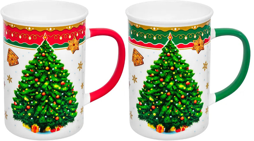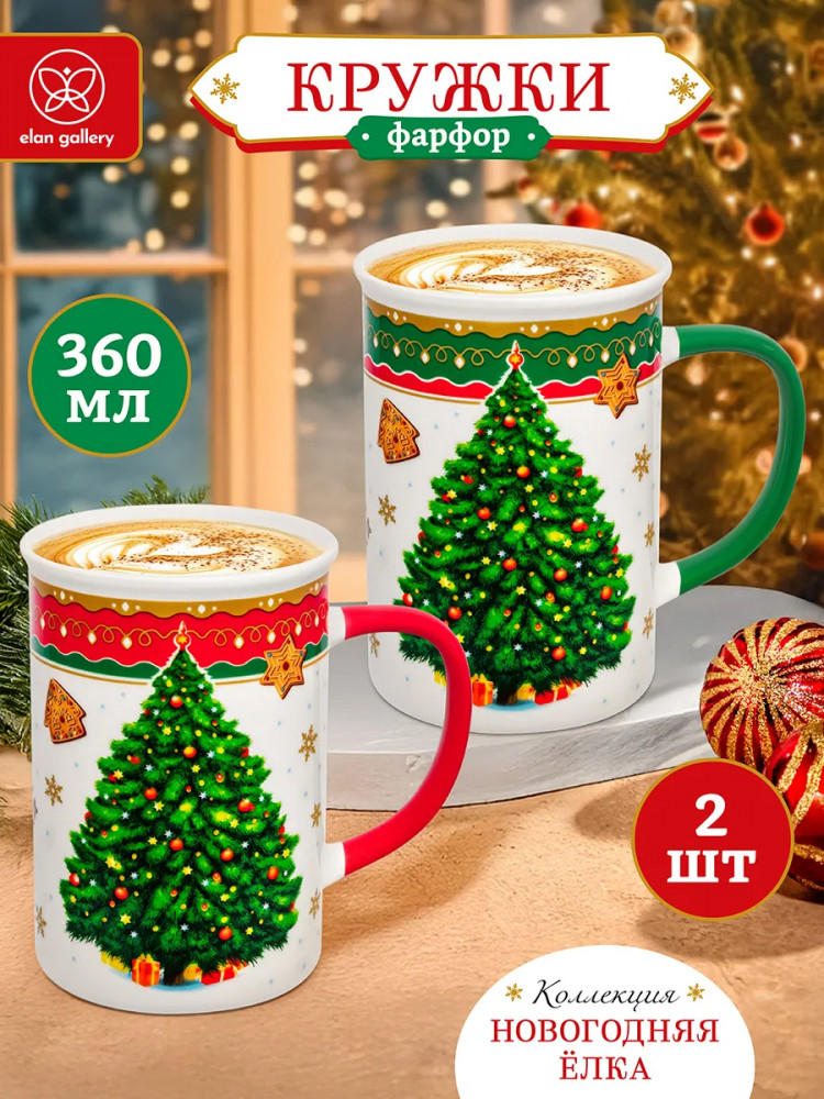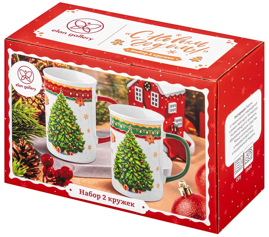 Набор 2 кружек «Новогодняя Елка» от Elan Gallery предназначен для эстетичной сервировки вашего стола. Размер каждой ёмкости — 11,5×7,5×11,5 см, объём — 360 мл. Выполнены из высококачественного белого фарфора. Он не впитывает цвет напитков и легко отмывается, благодаря чему надолго сохранит свою белизну. Поверхность украшена широкой цветной окантовкой, изображением пушистой наряженной ёлочки, узором из снежинок и имбирных пряников. На другой стороне — каллиграфической надписью «С Новым годом!». Кофейные кружки помогут вам провести множество приятных завтраков с капучино и латте, а также уютные чайные вечера с конфетами, вафлями и другими сладостями.