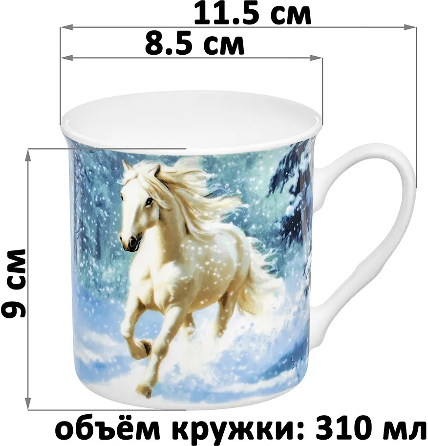 Набор 2 кружек «Лошадь в снегу» от Elan Gallery предназначен для эстетичной сервировки вашего стола. Размер каждой ёмкости — 11,5×8,5×9 см, объём — 310 мл. Выполнены из высококачественного белого фарфора. Он не впитывает цвет напитков и легко отмывается, благодаря чему надолго сохранит свою белизну. Поверхность изделий украшают рисунки лошадей, скачущих через снежный лес. Образ лошади символизирует энергию и свободу. Он отражает силу, красоту и неукротимый дух, вдохновляя на преодоление преград. Кофейные кружки помогут вам провести множество приятных завтраков с капучино и латте, а также уютные чайные вечера с конфетами, вафлями и другими сладостями. |