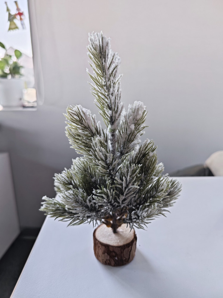 Милая пушистая ёлочка, хотя больше похожа на еловую веточку. Нравится, что как будто припорошена снегом, при этом не осыпается. Миниатюрная, много места не занимает.